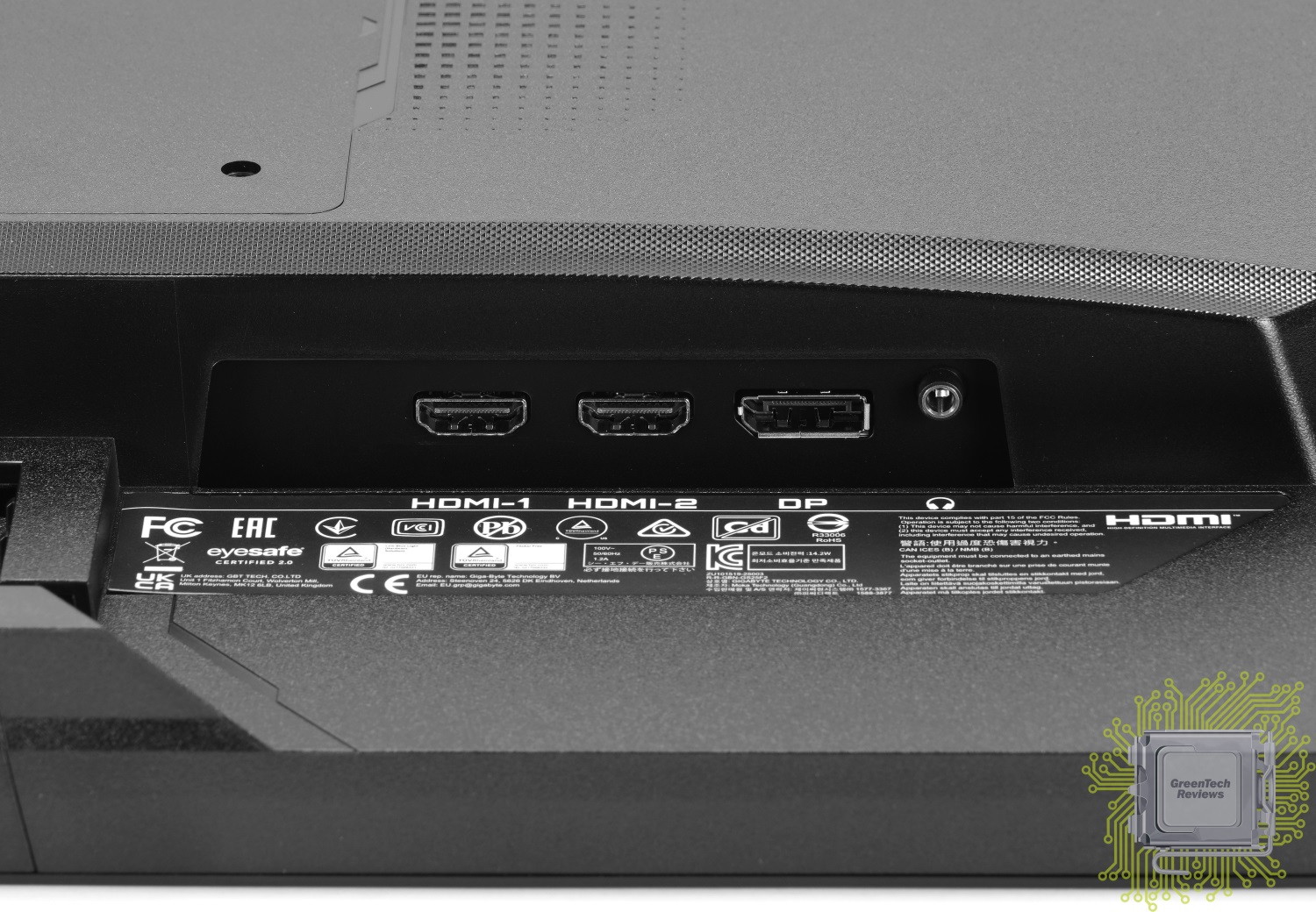 Для подключения источников видео сигнала нам доступны два HDMI 2.0 входа и DisplayPort 1.4 вход, рядом с которым расположен 3.5 мм аудио разъём.
