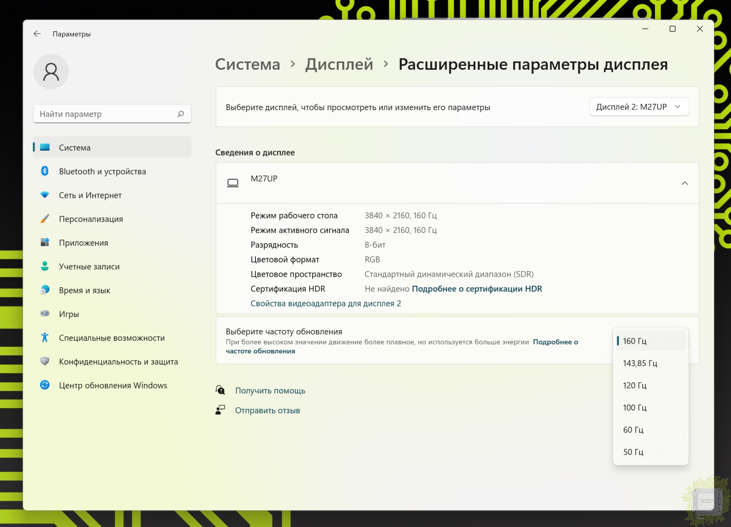 В отличие от практически всех остальных мониторов производителя, модель M27UP в 4K режиме позволяет выбрать частоту обновления в достаточно большом диапазоне значений — от 50 до 160 Гц.