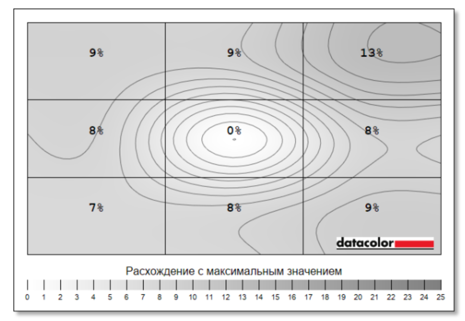 Максимальное отклонение яркости зафиксировано на отметке 13%, что можно назвать хорошим результатом. При заявленном значении 350 кд/м2 по результатам измерений было получено около 345 кд/м2 в стандартном режиме, но уровень яркости составляет при его активации 85%. Если «докрутить» яркость до 100%, то по результатам измерений было получено практически 400 кд/м2.