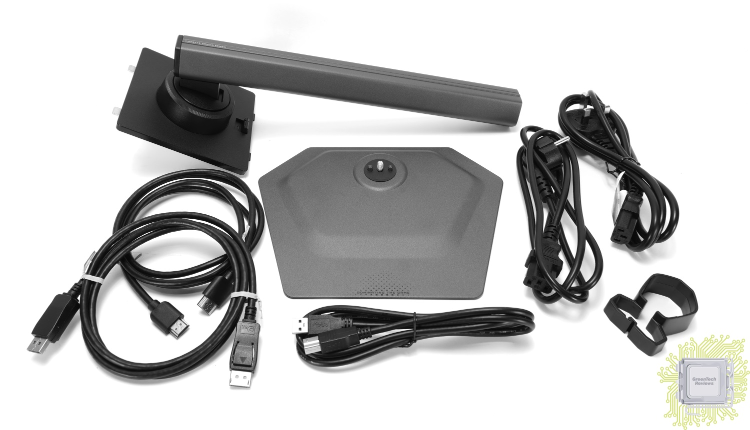 Комплект поставки включает в себя силовые кабели двух типов, DisplayPort кабель, HDMI кабель и USB (3.2 Gen1 Type-B) кабель. Блок питания встроен в монитор, поэтому такового внешнего в комплекте нет. И ещё в коробке в разобранном виде размещена подставка монитора. Дизайн она получила абсолютно новый (для некоторых мониторов 2025 года). Основание выполнено исключительно из металла, отличается минимальной толщиной, но впечатляющим весом — монитор на такой подставки устойчив.