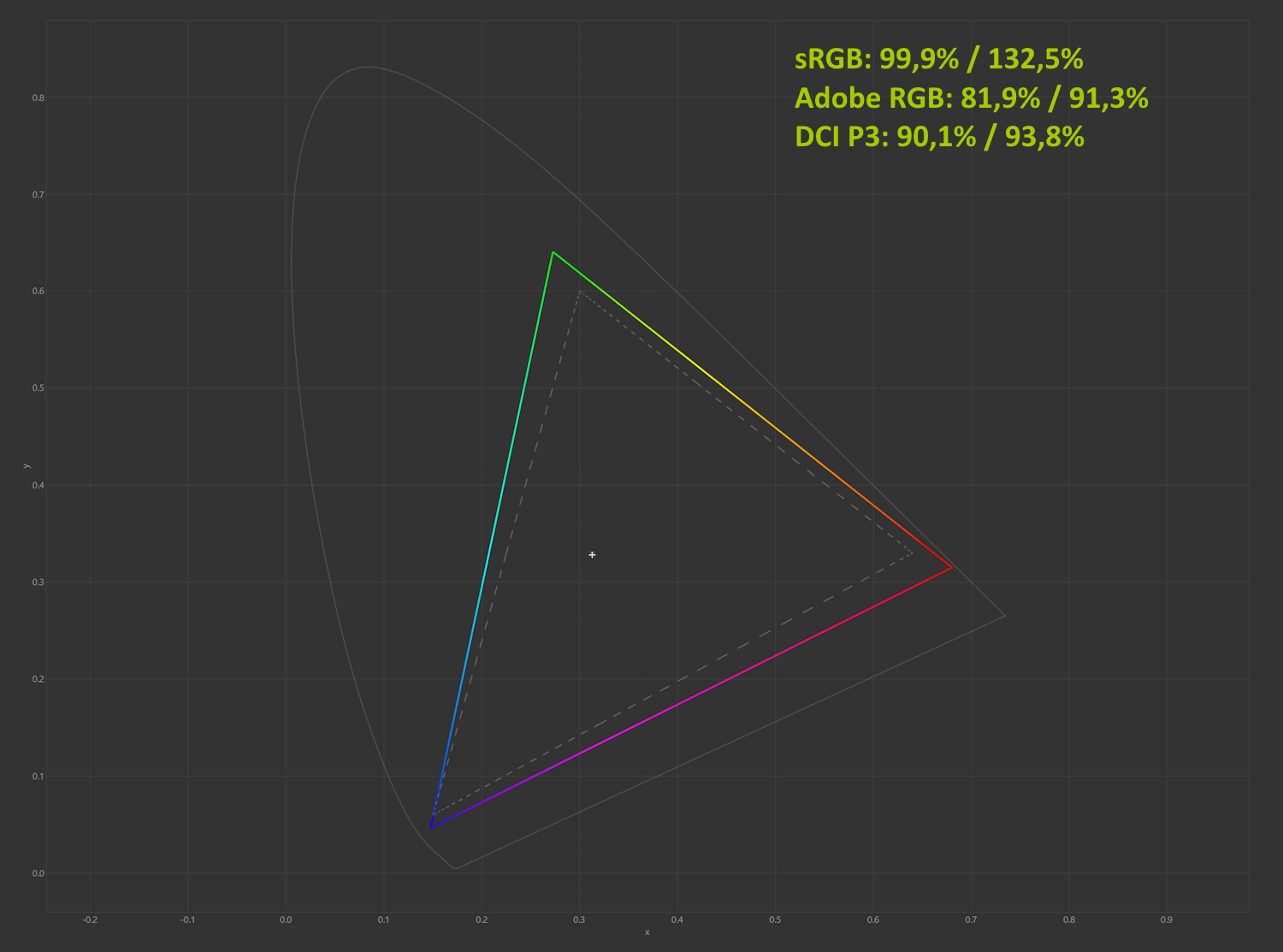При стандартных настройках дисплей соответствует sRGB на 99,9% (полный охват — 132,5%), Adobe RGB на 81,9% (полный охват — 91,3%) и DCI P3 на 90,1% (полный охват — 93,8%). Здесь никаких вопросов — заверения производителя о 125% для sRGB подтвердились полностью. Ну и до 95% DCI P3 практически дотянули.