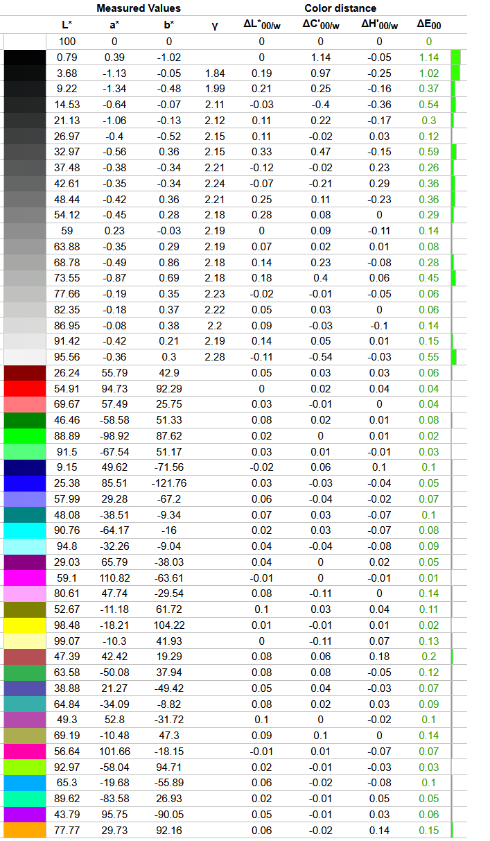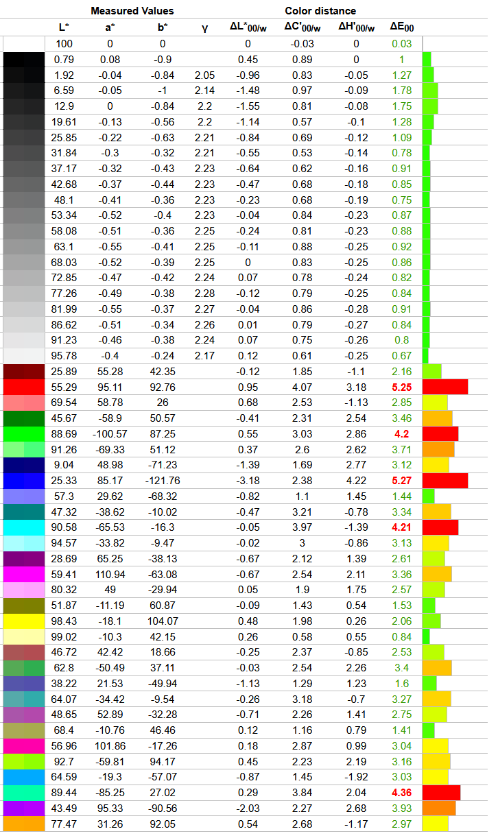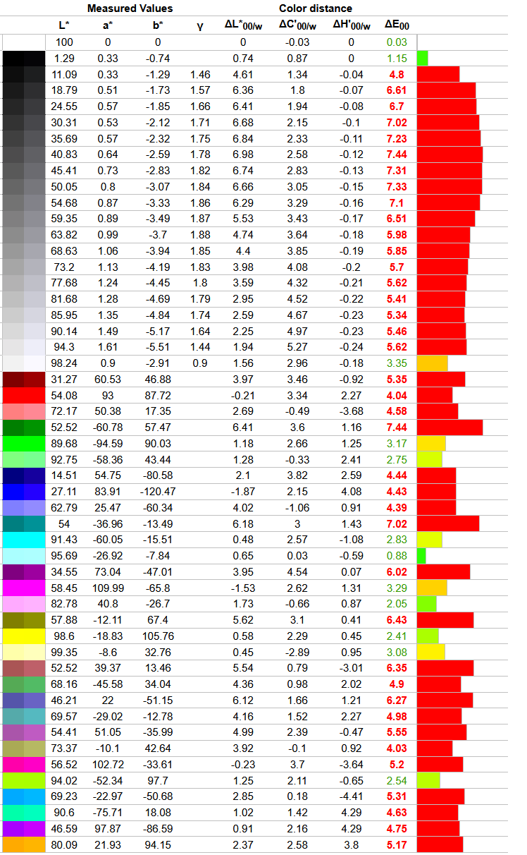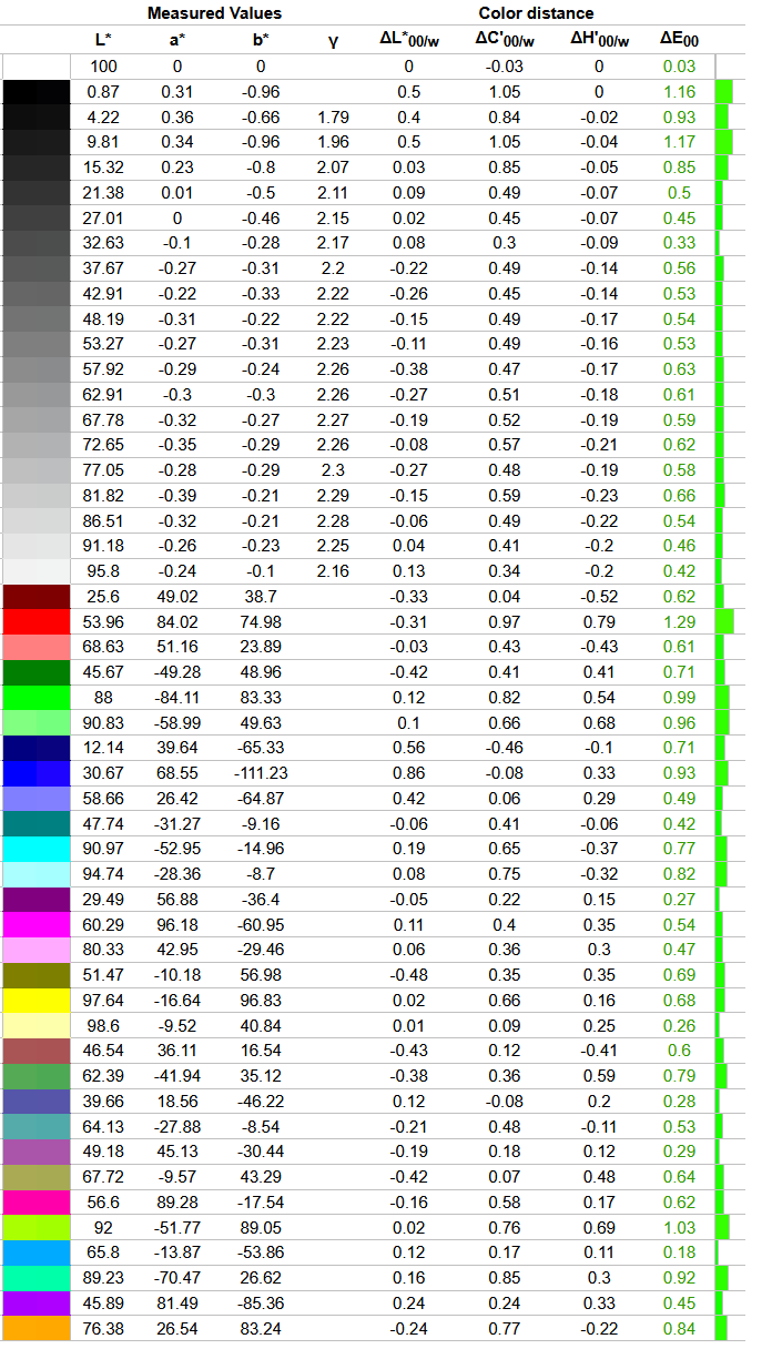 Что касается отклонений цветопередачи, то мы получили такие результаты. Напомним, что очень хорошими результатами являются показатели отклонения DeltaE (среднее значение) менее единицы, а максимальное отклонение DeltaE – менее трёх.