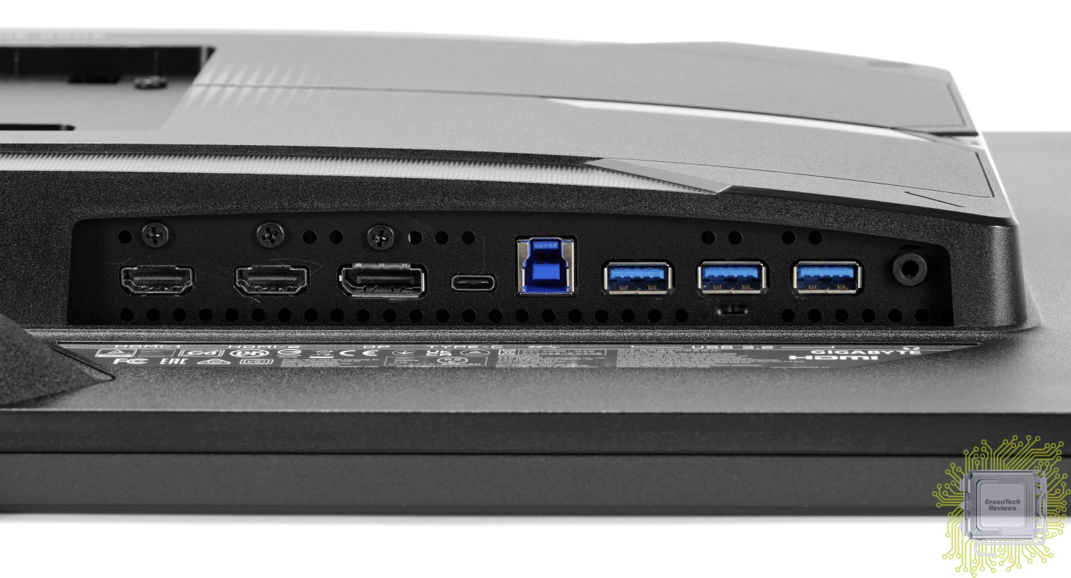Для подключения источников видео сигнала нам доступны два HDMI 2.1 входа, DisplayPort 1.4 (DSC) вход и интерфейс Type-C (AltMode, Power Delivery до 18 Вт). Рядом находится USB хаб — вход Type-B и три выхода Type-A, с которым расположен 3.5 мм аудио разъём.