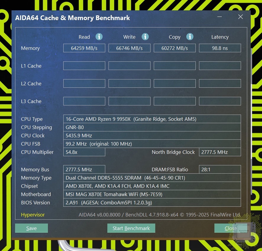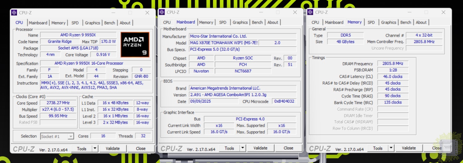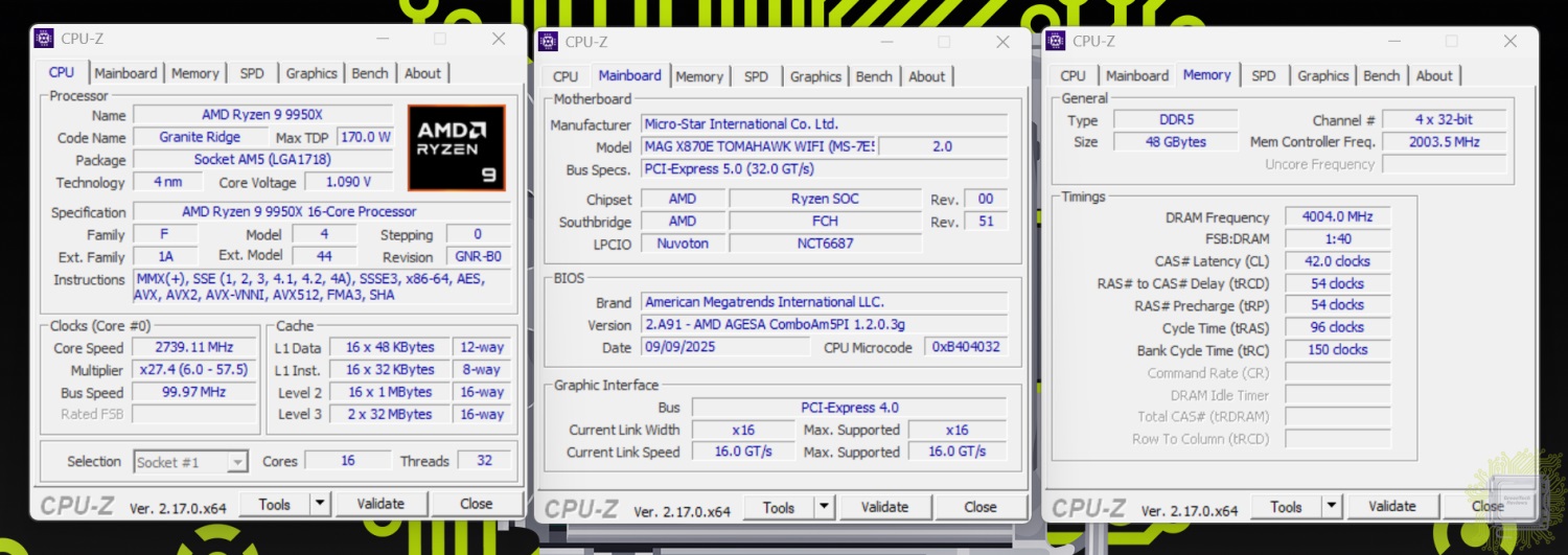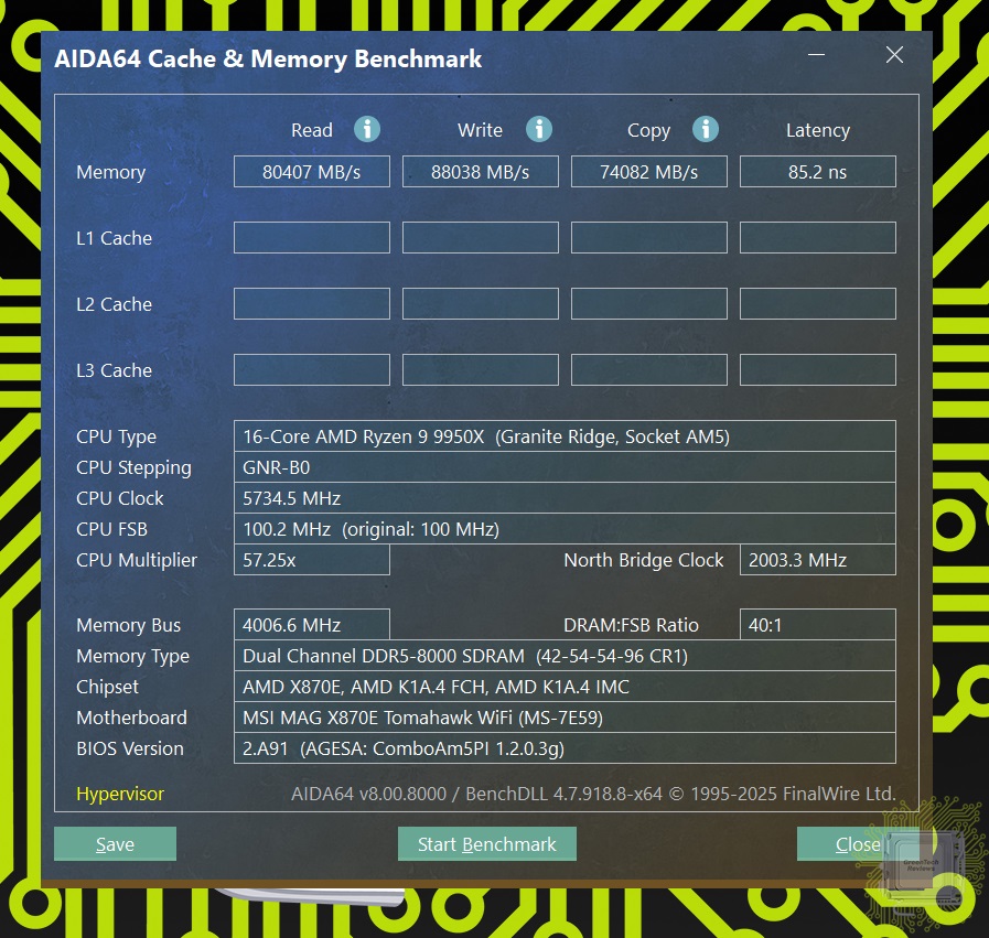 Для тестирования был взят процессор Ryzen 9 9950X и память DDR5 с XMP профилем 8000 МТ/с. Отвод тепла от процессора обеспечивала сборная система жидкостного охлаждения. Сначала — номинальный режим работы процессора и памяти.