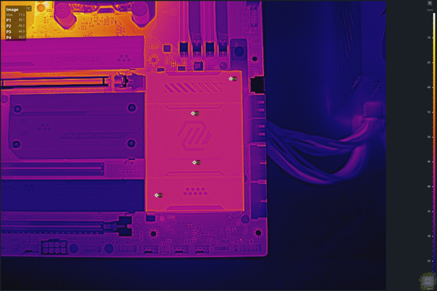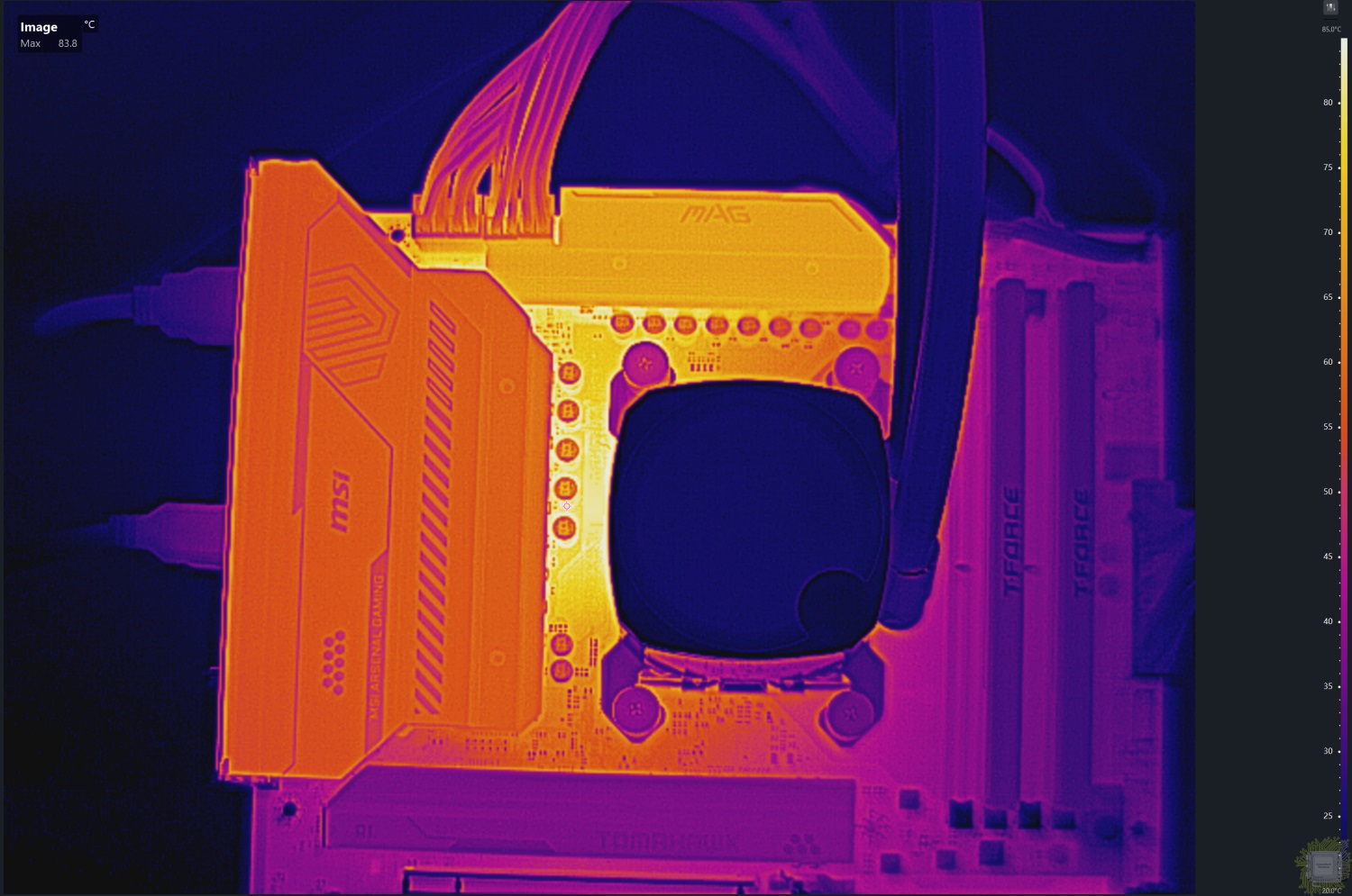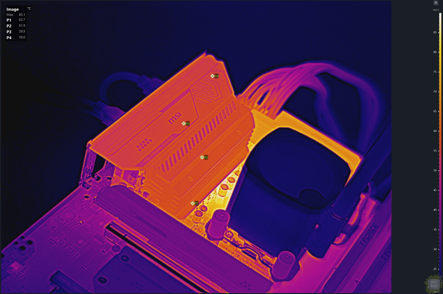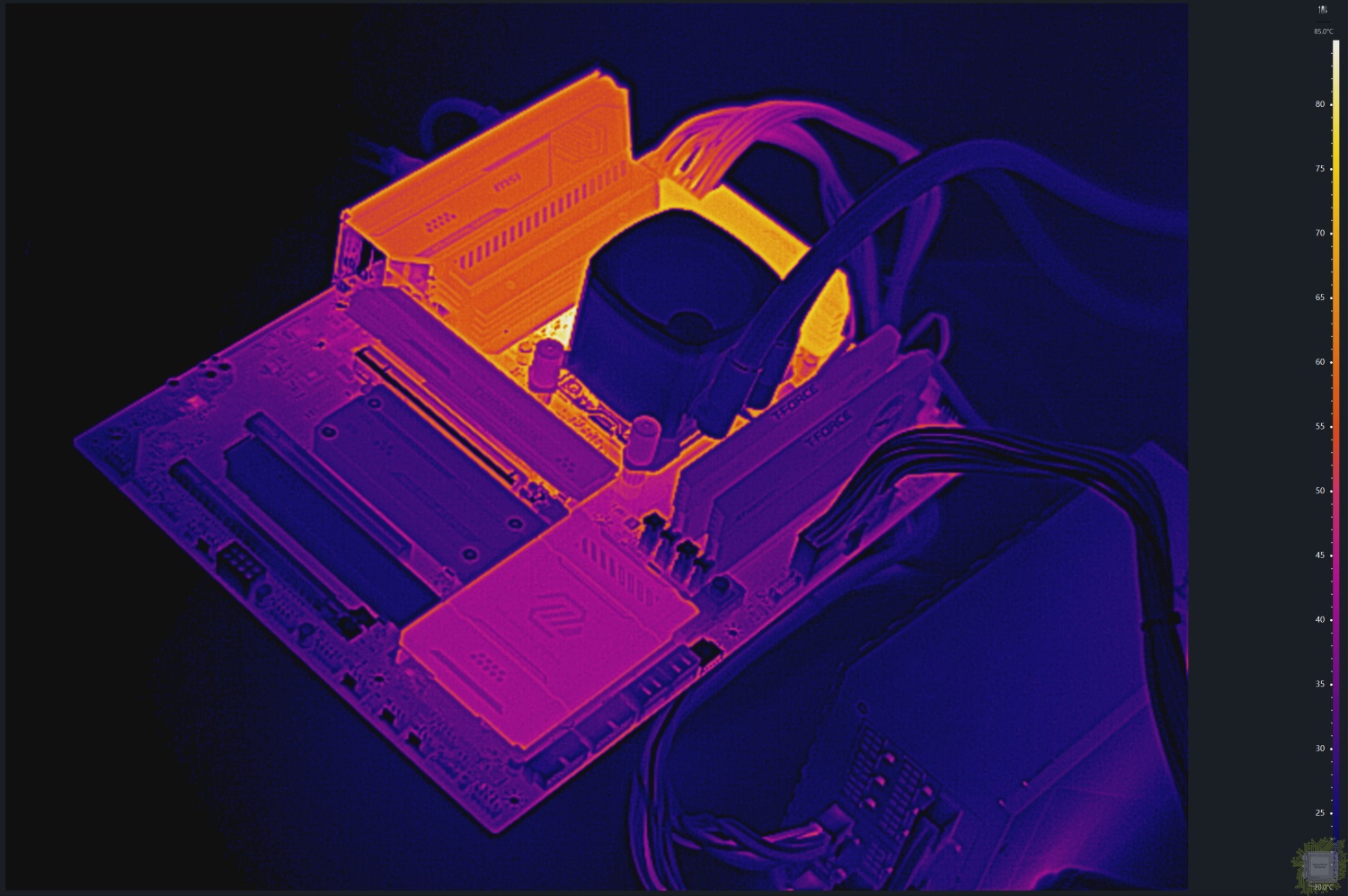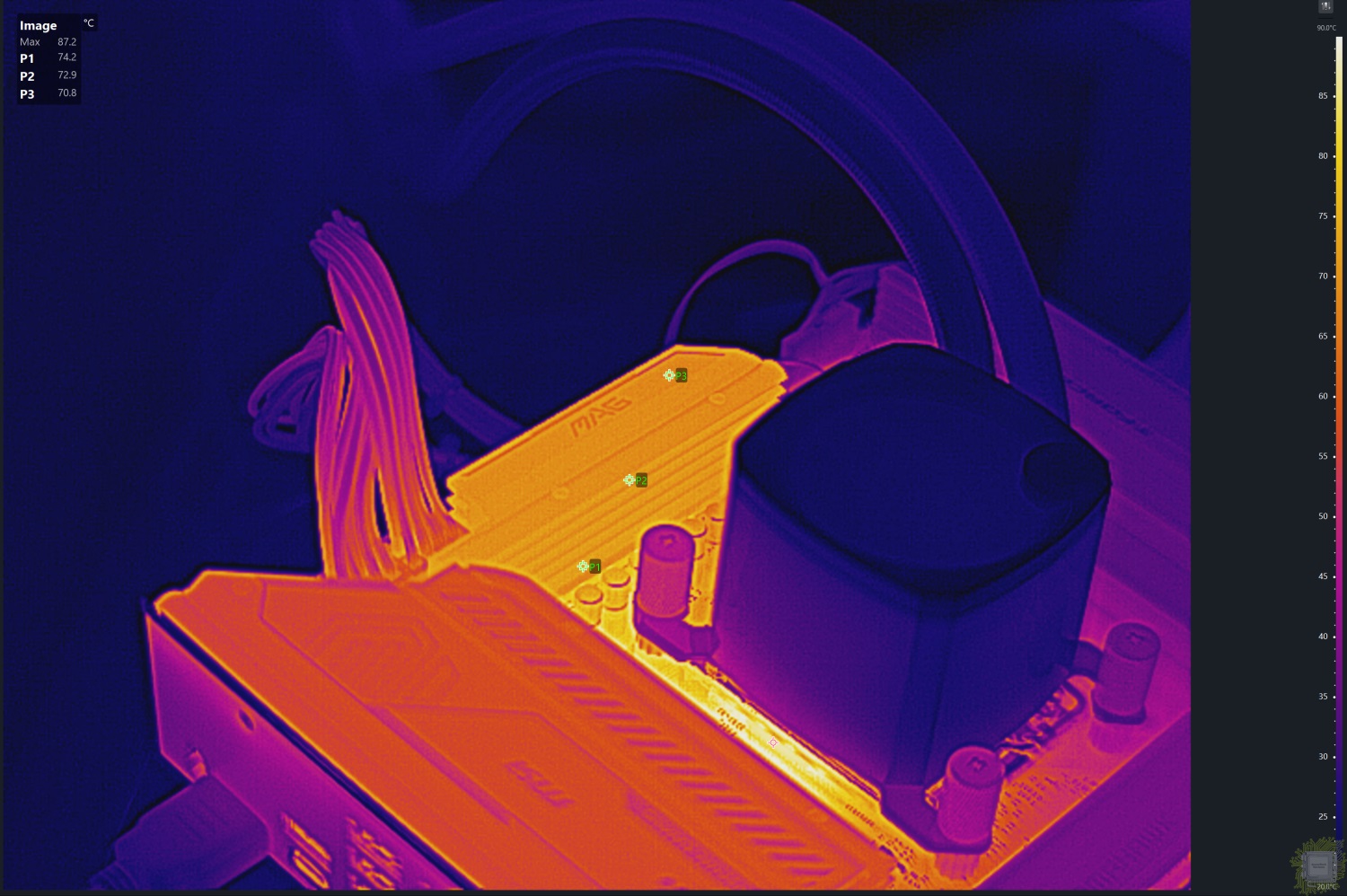 Теперь самое интересное — о температуре подсистемы питания. Напомним, что от процессора тепло отводится системой жидкостного охлаждения. Энергопотребление процессора на момент тестирования составляло 240-250 Вт.