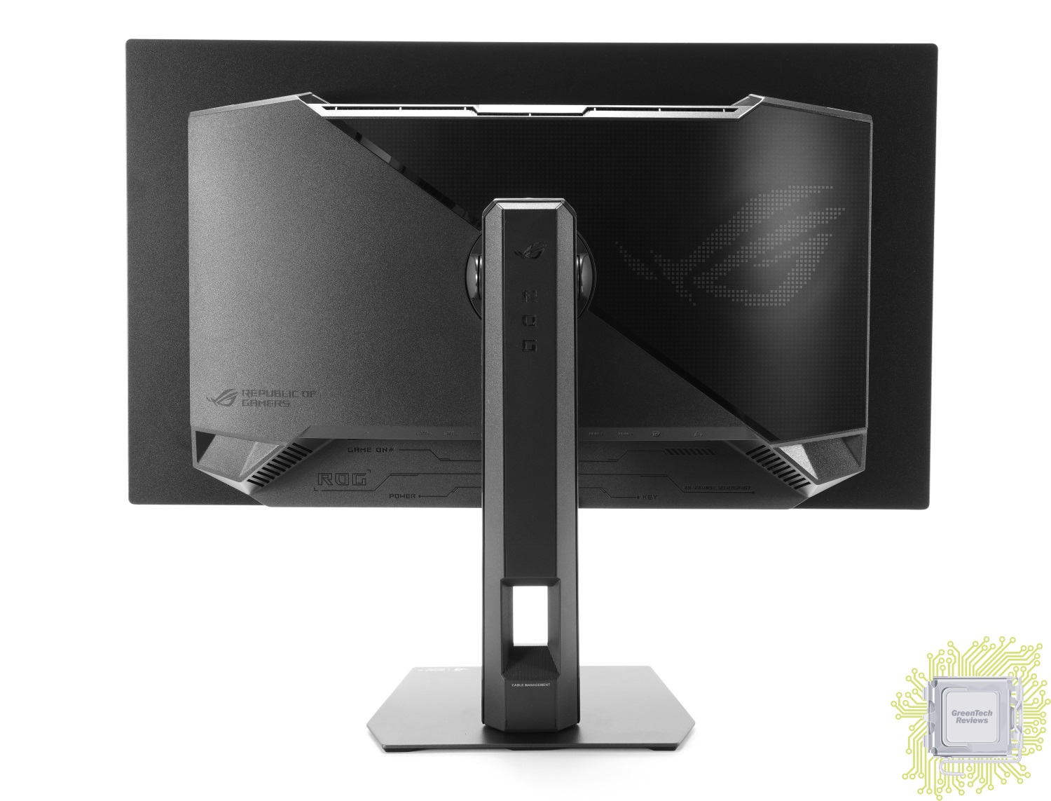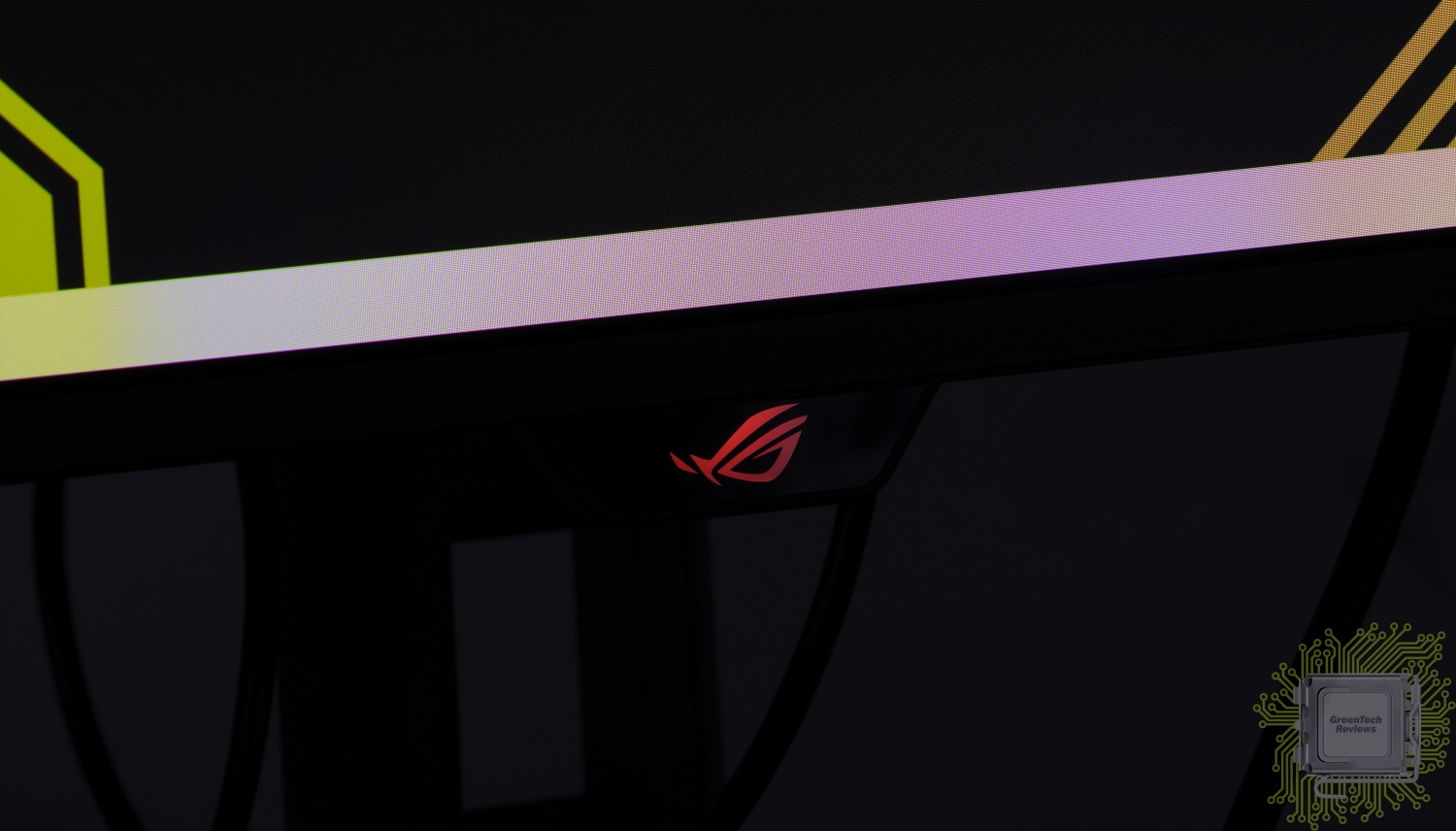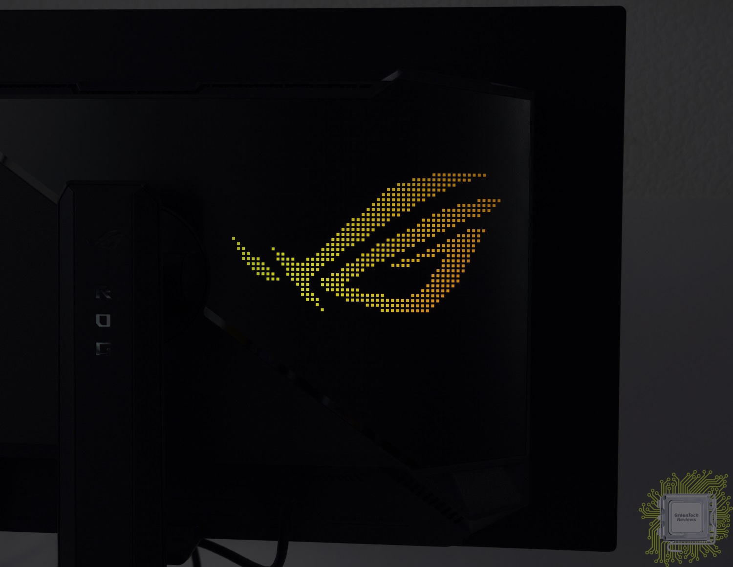 В отличие от старших моделей, подсветка у которых реализована в нескольких местах подставки (сзади, проекция), у данного монитора реализован только логотип бренда, который состоит из множества подсвечивающихся квадратиков.