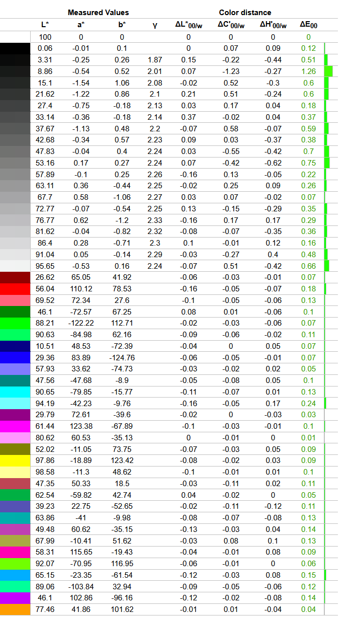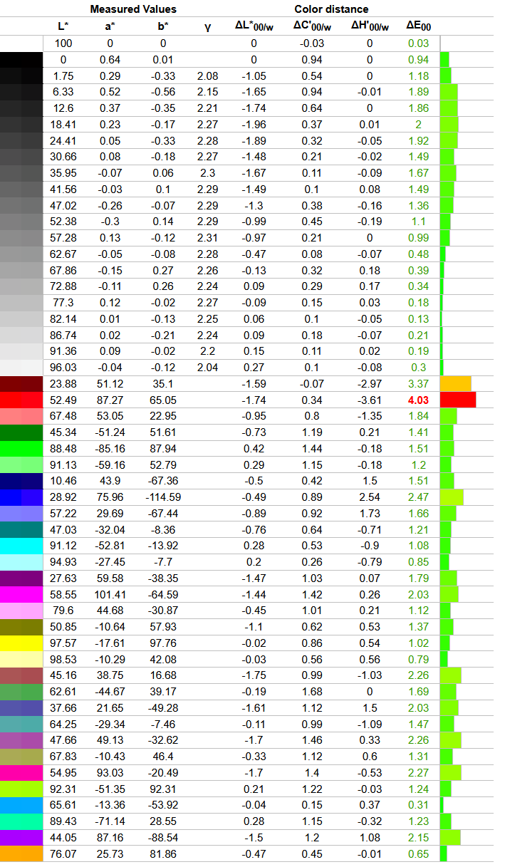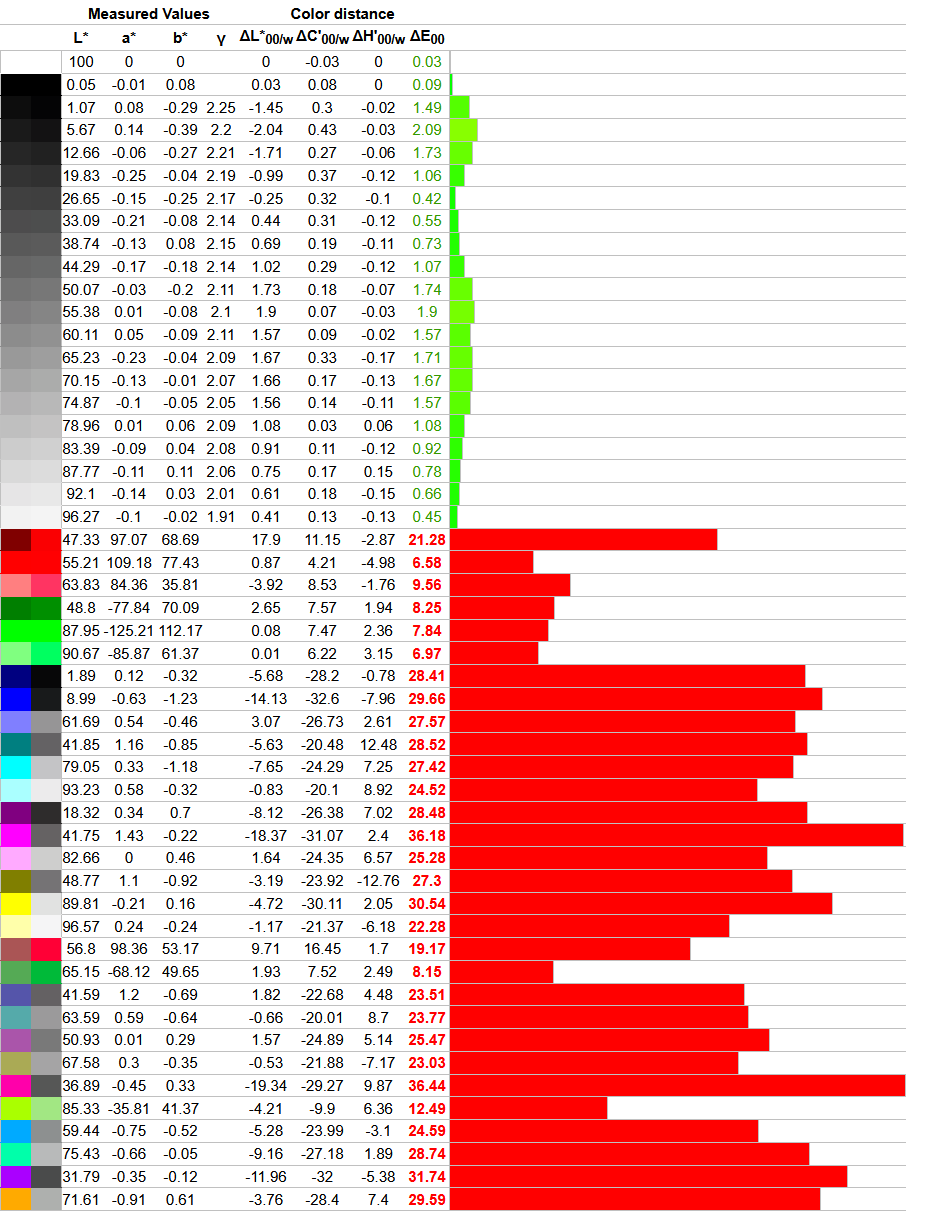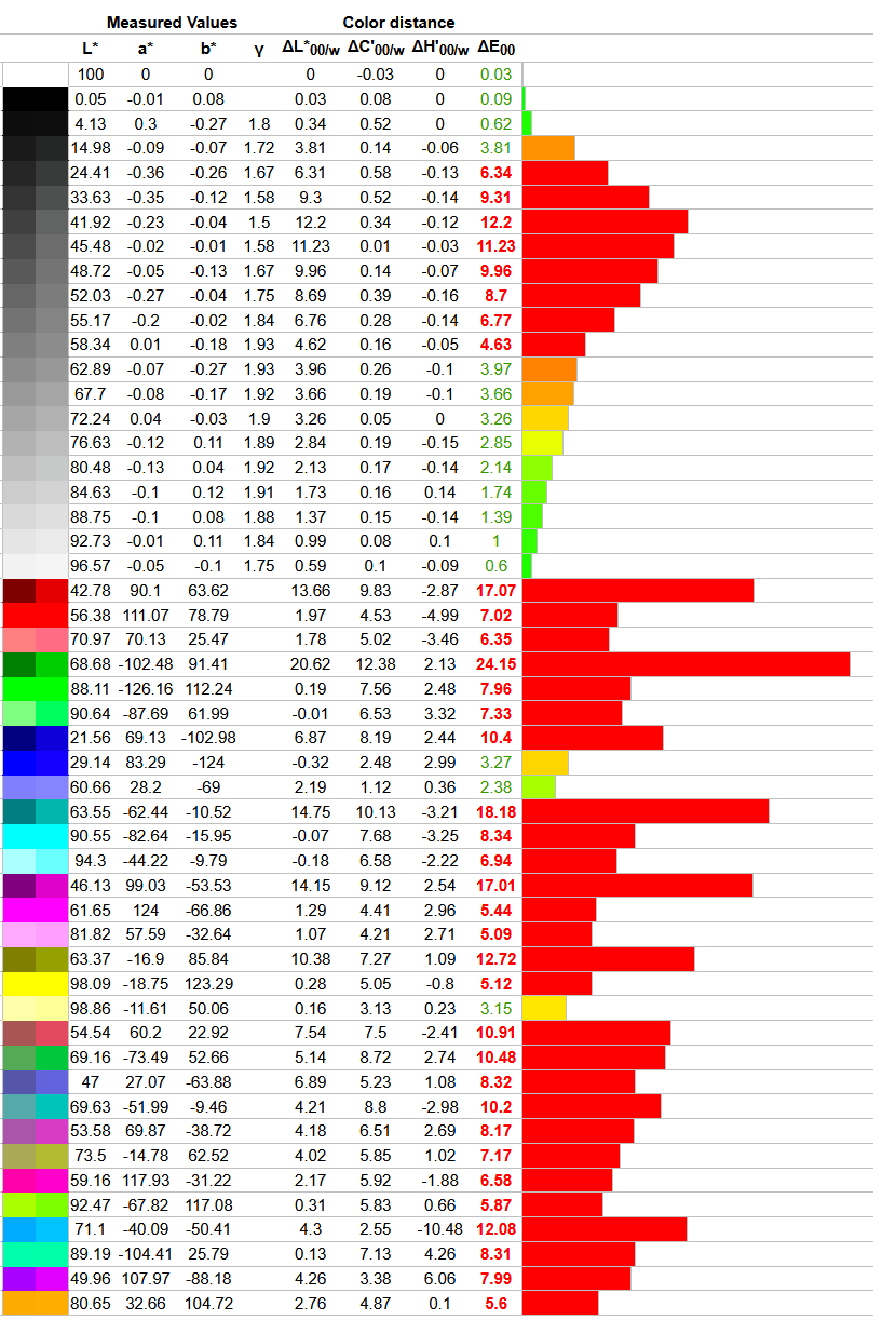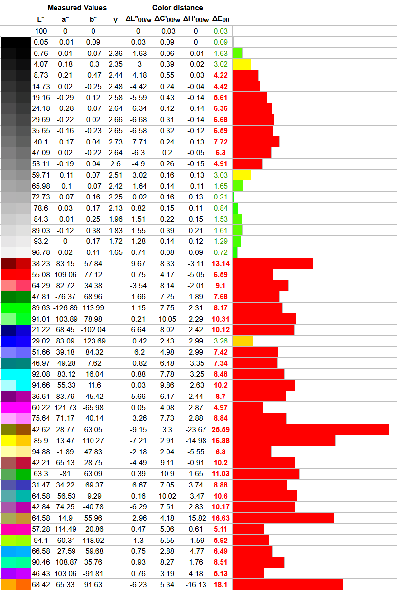 Что касается отклонений цветопередачи, то мы получили такие результаты. Напомним, что очень хорошими результатами являются показатели отклонения DeltaE (среднее значение) менее единицы, а максимальное отклонение DeltaE – менее трёх.