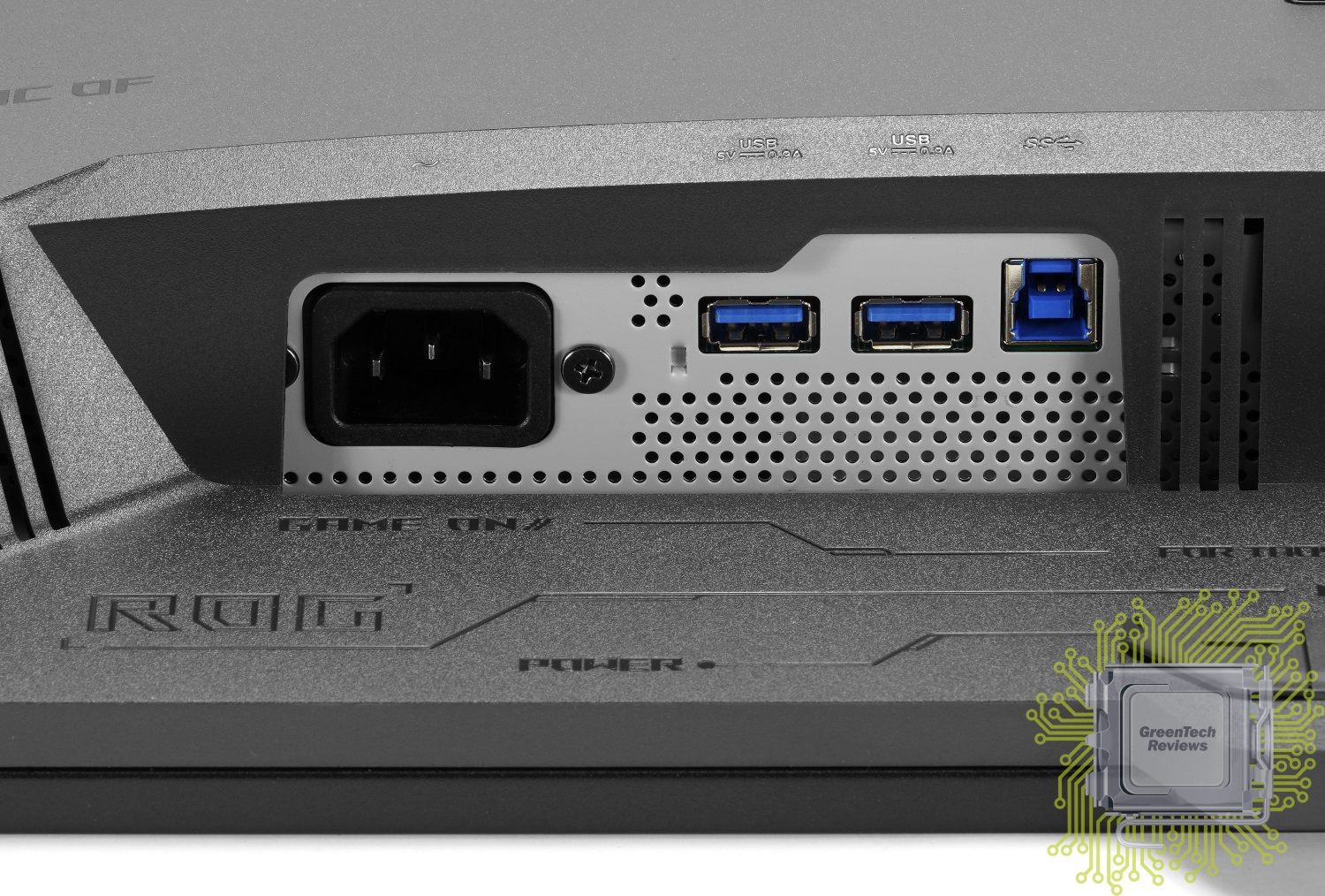 Чуть поодаль размещены разъём для подключения кабеля питания, а также два USB 3.2 Gen 1 Type-A и один Type-B вход.