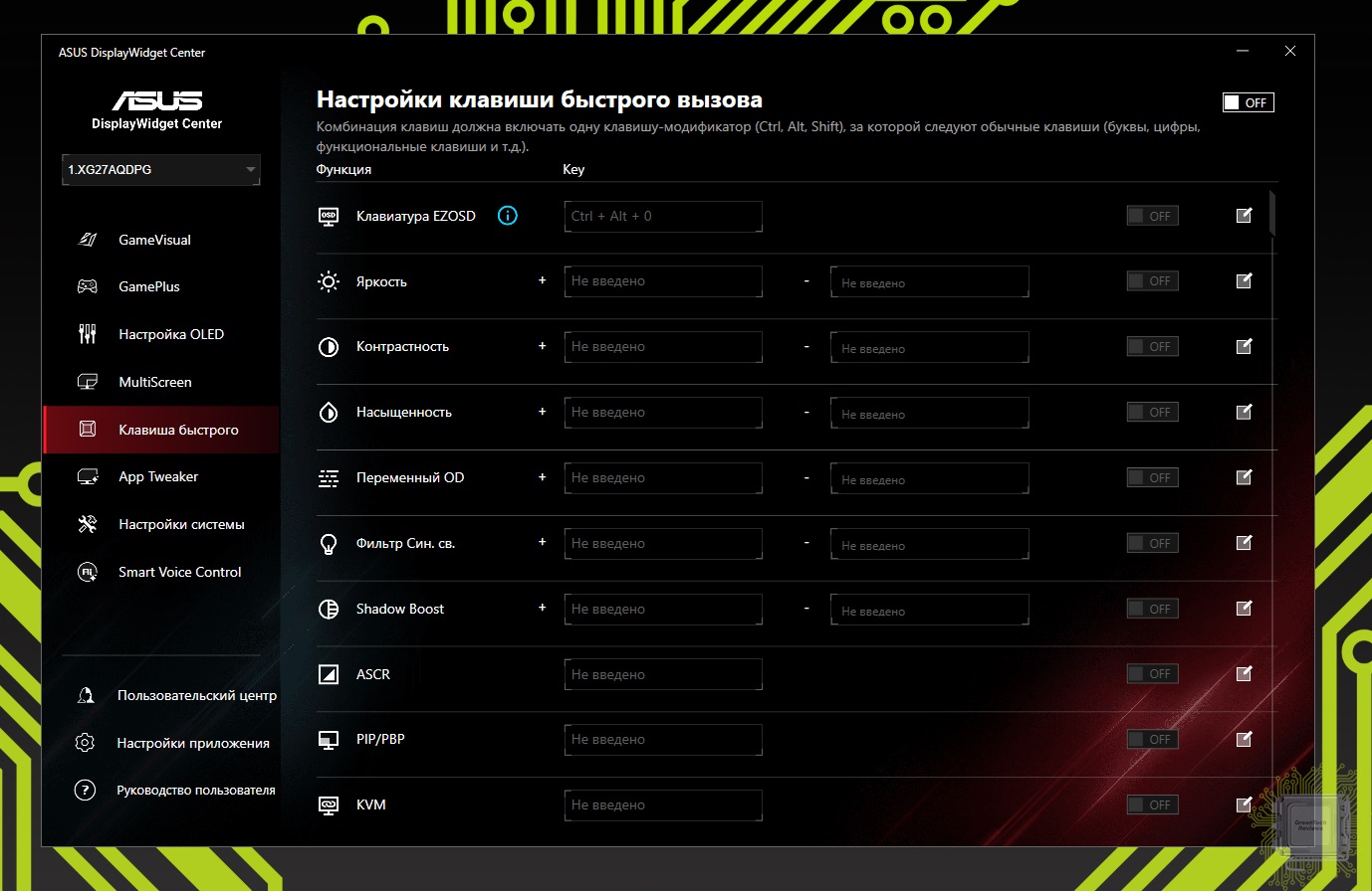 Реализована возможность настроить горячие клавиши (для клавиатуры), которые будут выполнять определённые действия с монитором.