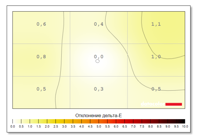 С равномерностью цвета дела обстоят тоже хорошо — максимальное отклонение 1,1 (для профессиональной работы с графикой допускается максимальное значение 3).