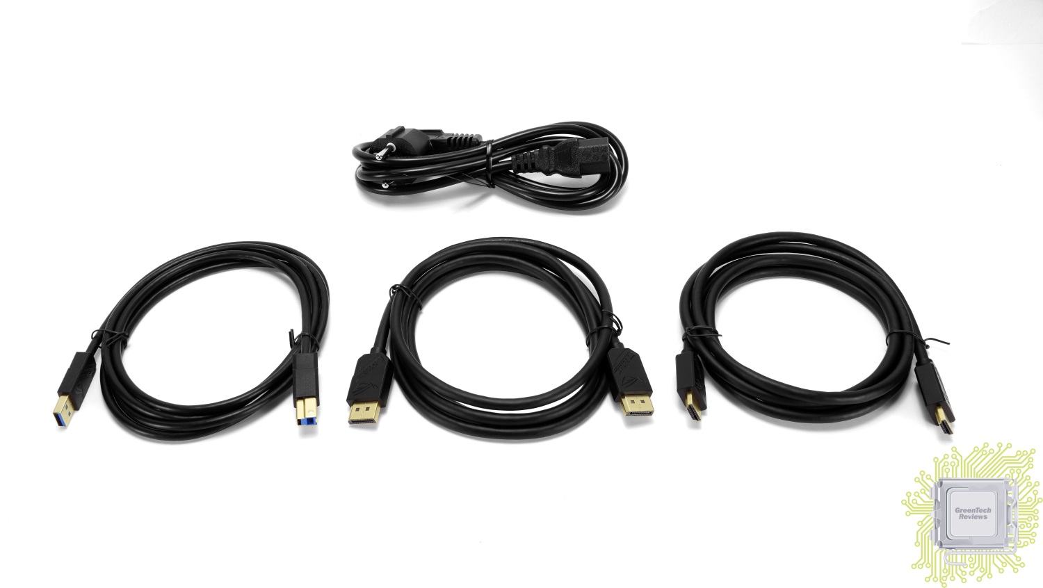 Это три кабеля — USB Type-C, USB Type-B (3.0), HDMI и DisplayPort. Кабель питания тоже есть в комплекте поставки.