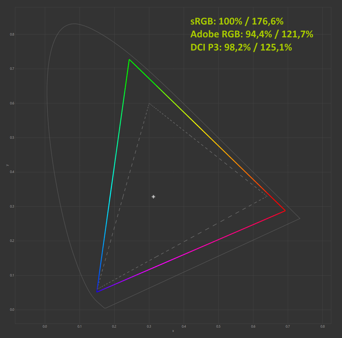 При стандартных настройках дисплей соответствует sRGB на 100% (полный охват — 176,6%), Adobe RGB на 94,4% (полный охват — 121,7%) и DCI P3 на 98,2% (полный охват — 125,1%).