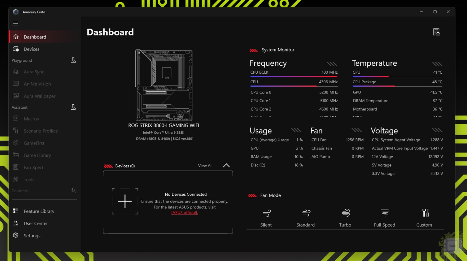 Для управления системой и мониторинга её параметров производитель комплектует плату фирменным программным обеспечением — Armoury Crate.