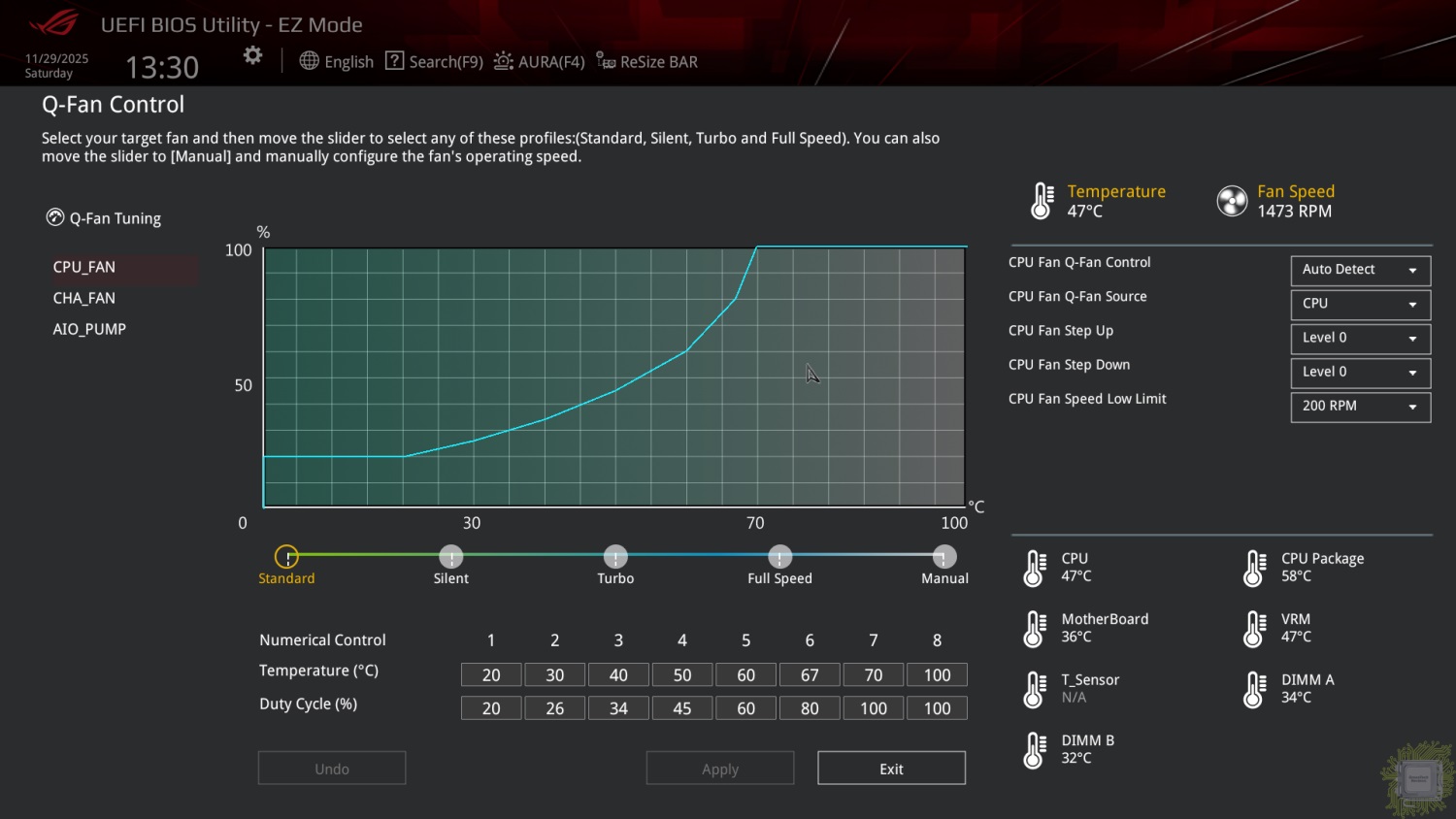 По нажатию кнопки Q-Fan Control (кнопка F6) появляется график настройки двух вентиляторов и одной помпы для системы жидкостного охлаждения.