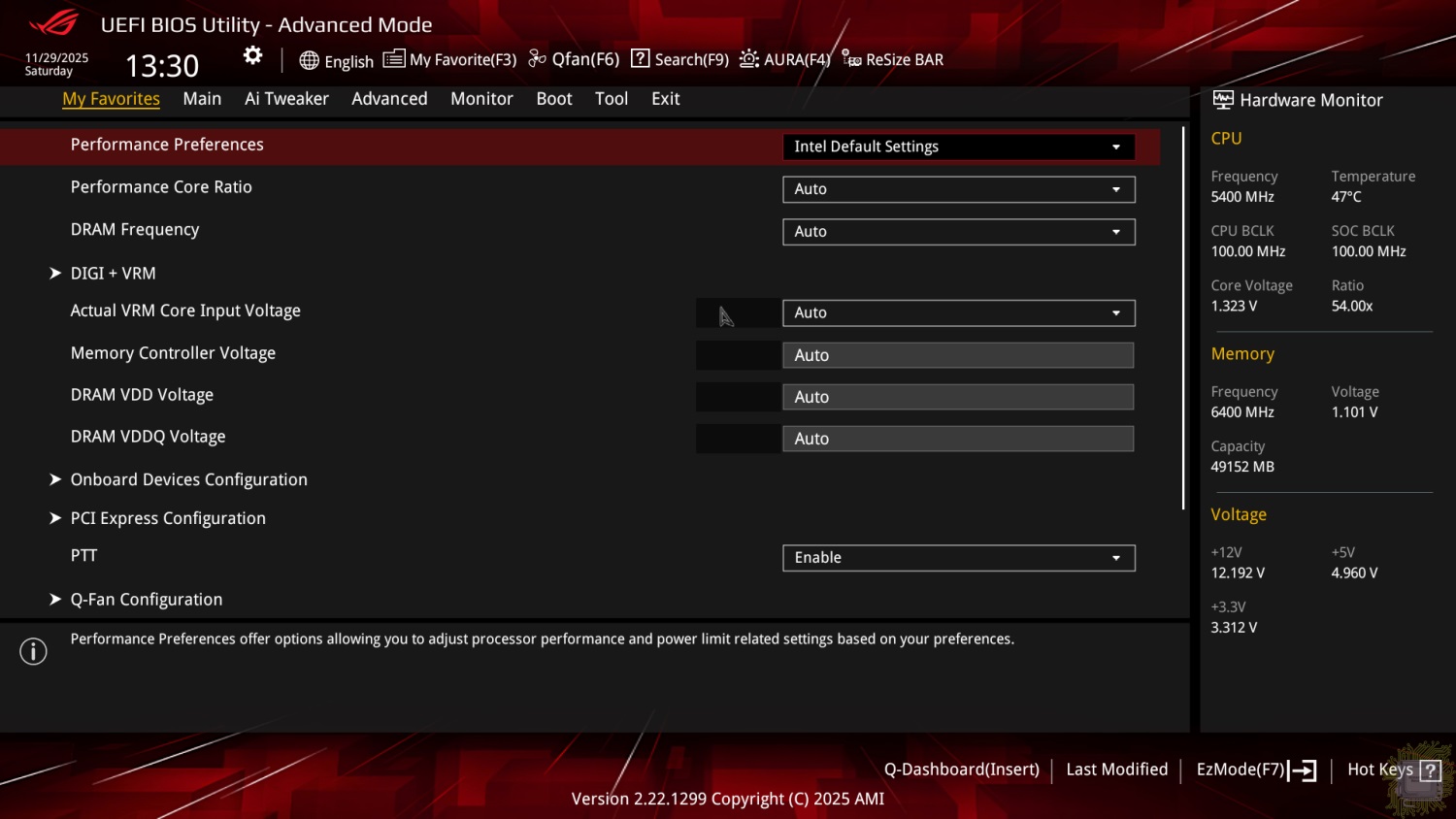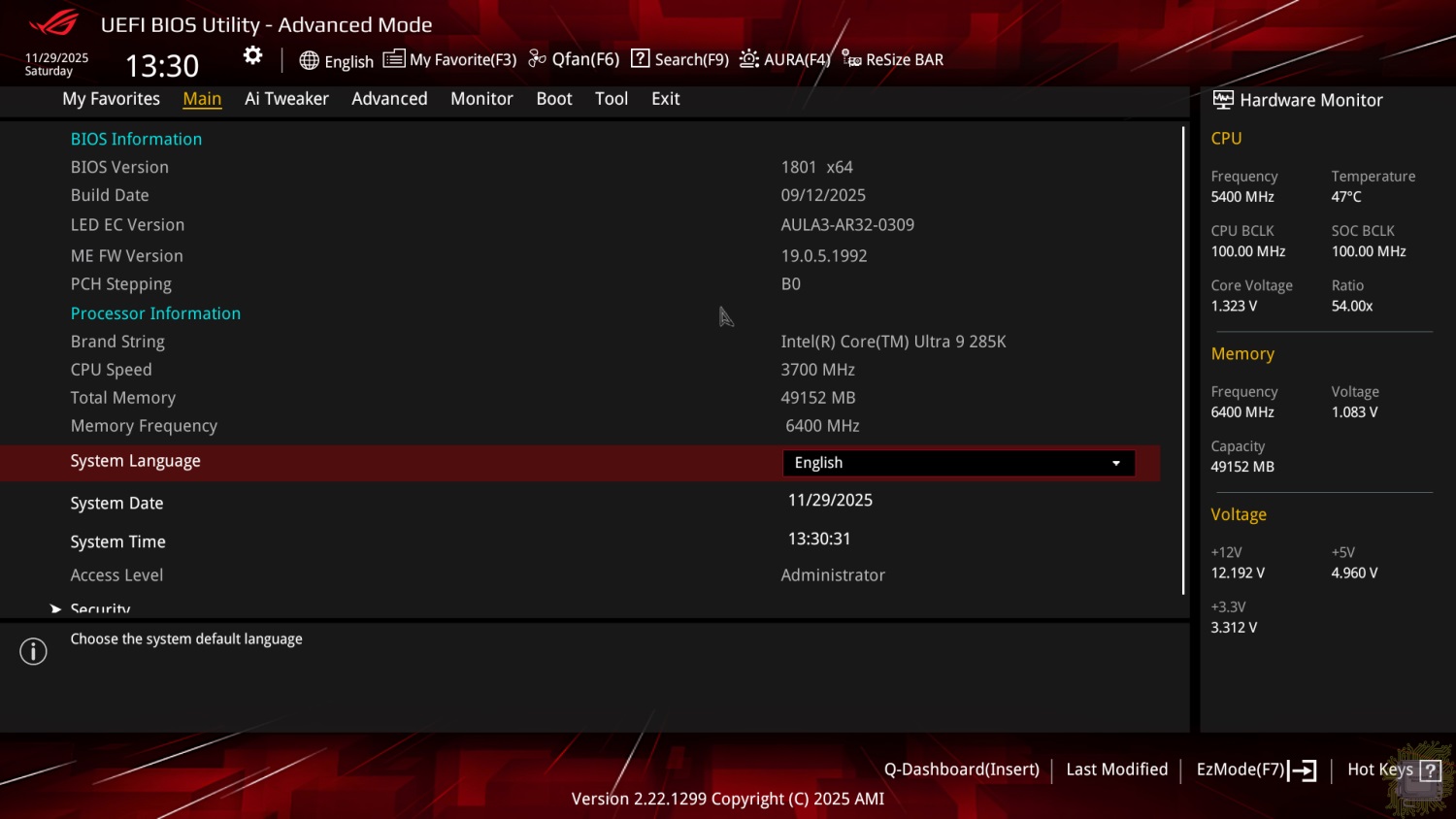 По умолчанию загружается упрощённый режим (EZ Mode), который встречает нас стартовым экраном, на котором показана основная информация о подключённых устройствах — память, SATA-накопители, вентиляторы, процессор, а также температура и напряжение процессора, скорости вращения вентиляторов и режим работы системы.