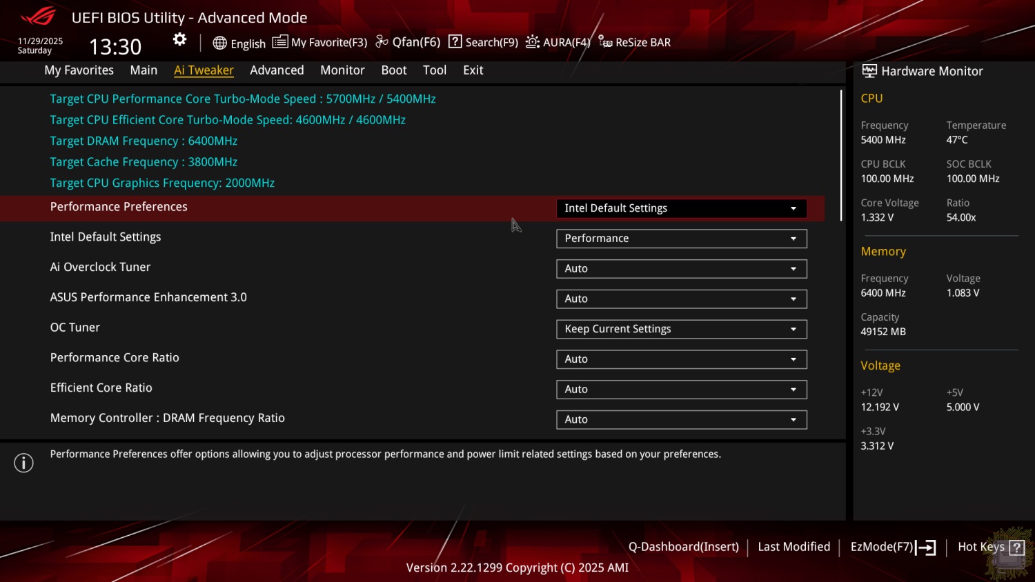 В Ai Tweaker собраны все настройки для разгона системы. Всевозможных настроек частот процессора (кроме увеличения множителя сверх допустимых лимитов Turbo), базовой частоты, оперативной памяти, кеша процессора достаточно много для «домашнего» разгона в рамках платформы.