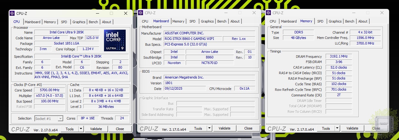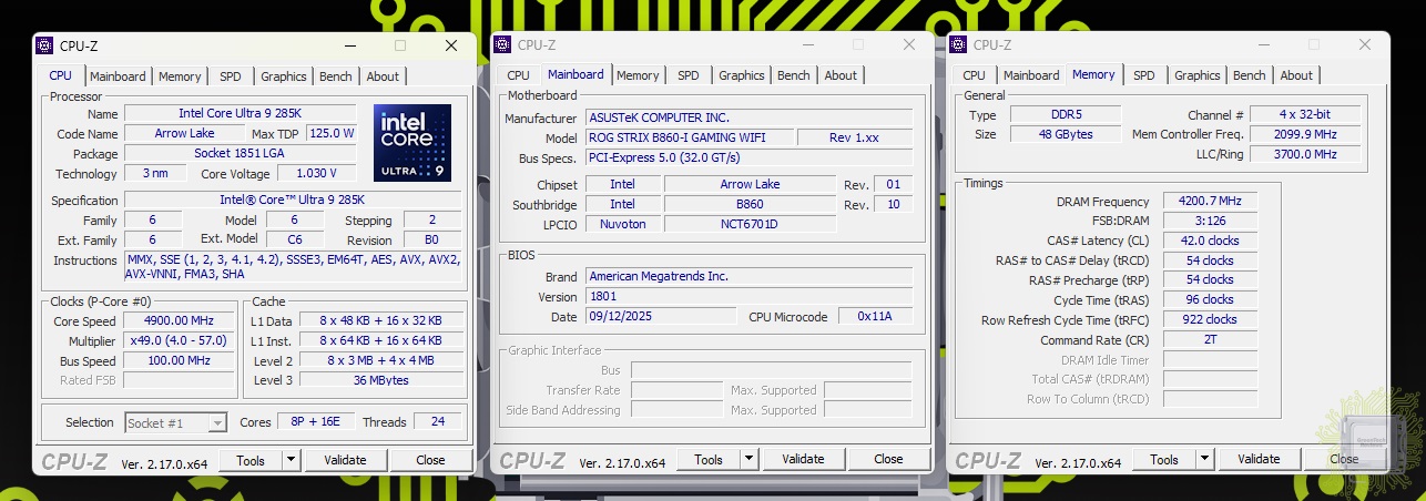 ASUS ROG STRIX B860-I GAMING WIFI — достаточно интересная материнская плата для процессоров Arrow Lake-S и предстоящих Arrow Lake-S Refresh, способная обеспечить стабильную работу любого из этих процессоров в паре с высокоскоростной оперативной памятью. Но по разгону памяти не всё так хорошо, как хотелось бы. И ещё одна проблема — сильный нагрев чипсета и SSD при использовании последнего с шиной PCIe 5.0. В остальном же явных нареканий к плате нет — она обладает первоклассной компонентной базой и характерна наличием всех современных высокоскоростных интерфейсов для подключения всевозможных устройств. Примечательно то, что подсистема питания ЦП отличается полностью пассивной системой охлаждения, но её эффективности вполне достаточно. Для системы формата mini-ITX материнская плата ASUS ROG STRIX B860-I GAMING WIFI предлагает достаточно широкие возможности для сборки игровой или рабочей системы в среднем ценовом диапазоне.
