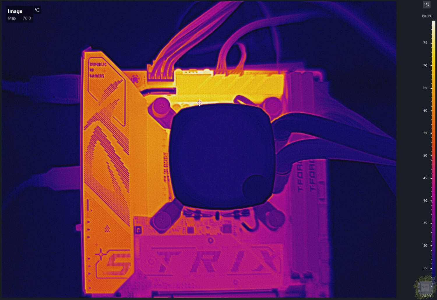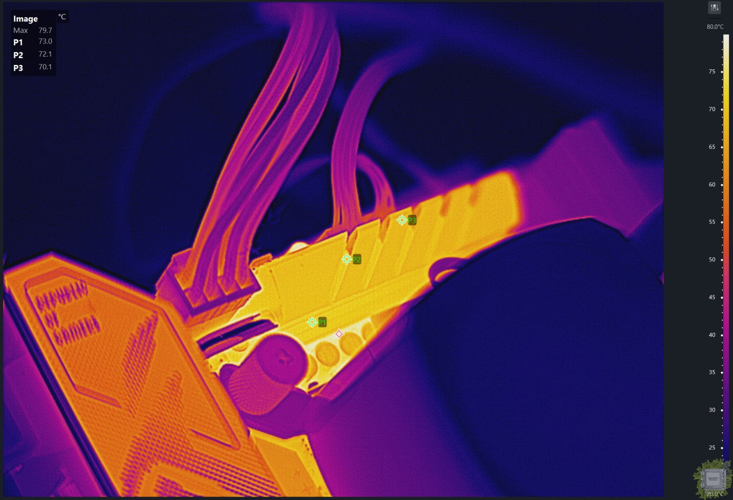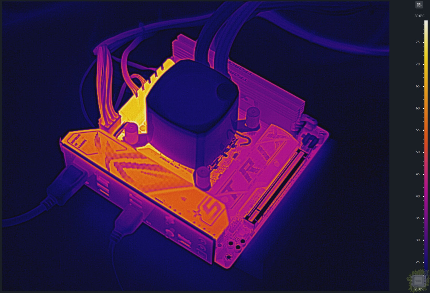 Теперь самое интересное — о температуре подсистемы питания. Напомним, что от процессора тепло отводится системой жидкостного охлаждения. Энергопотребление процессора на момент тестирования составляло 240-250 Вт.