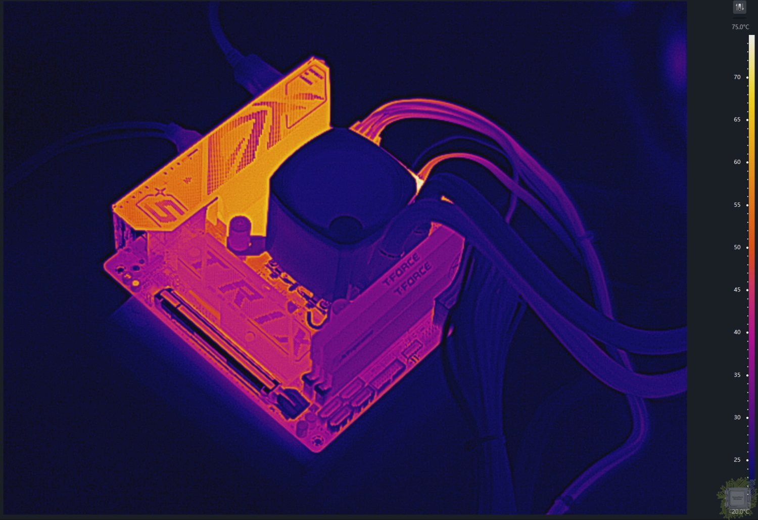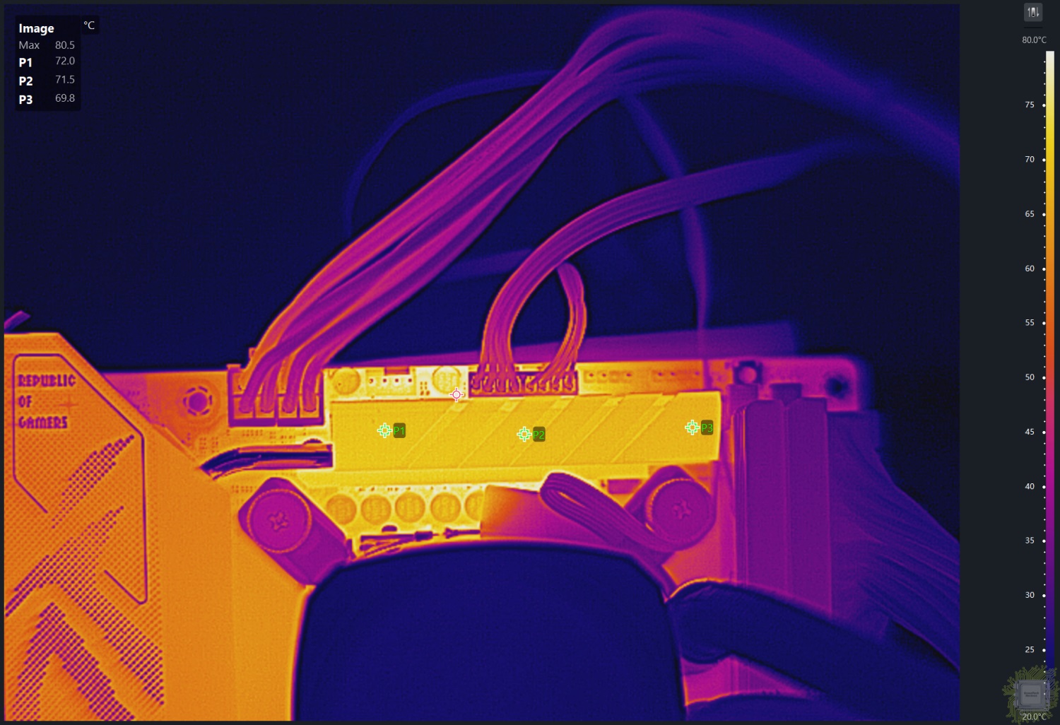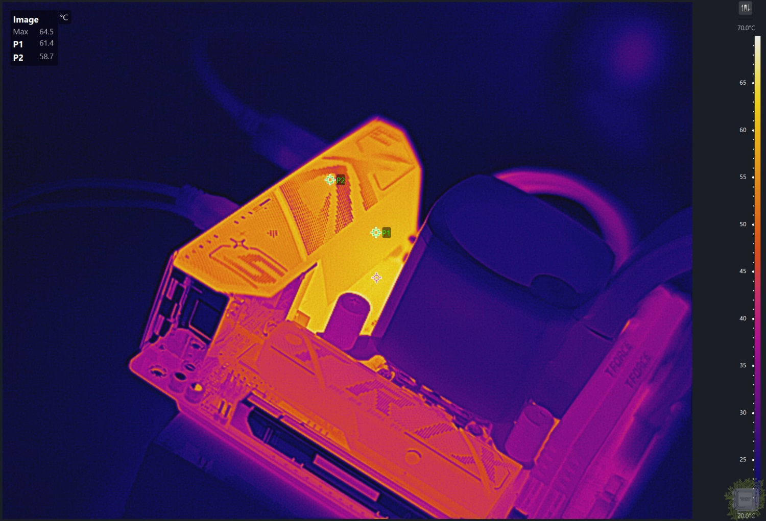 Теперь самое интересное — о температуре подсистемы питания. Напомним, что от процессора тепло отводится системой жидкостного охлаждения. Энергопотребление процессора на момент тестирования составляло 240-250 Вт.