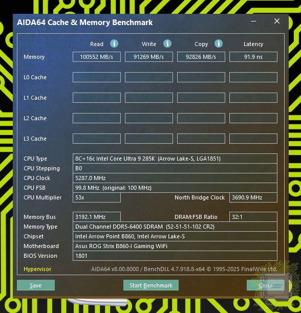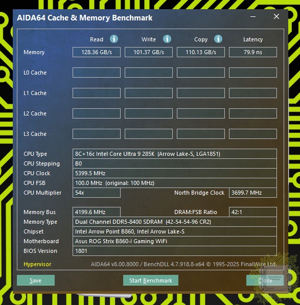 Для тестирования был взят процессор Core Ultra 9 285K и память DDR5 с XMP профилем 8800 МТ/с и возможностью разгона до 9600 МТ/с. Отвод тепла от процессора обеспечивала система жидкостного охлаждения. Сначала — номинальный режим работы процессора и памяти.