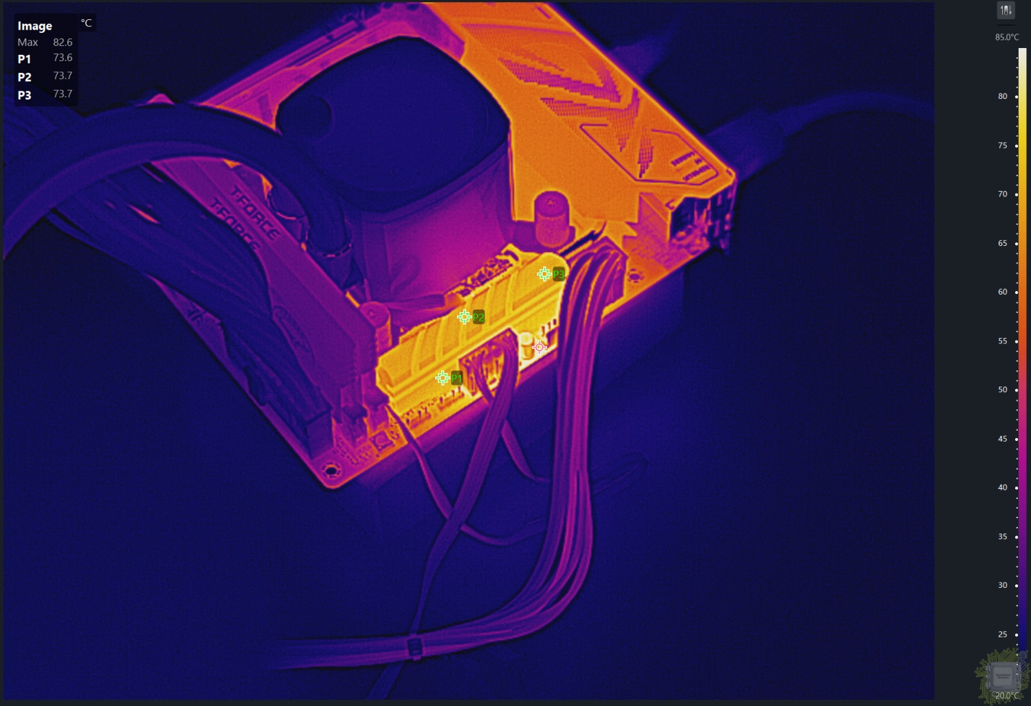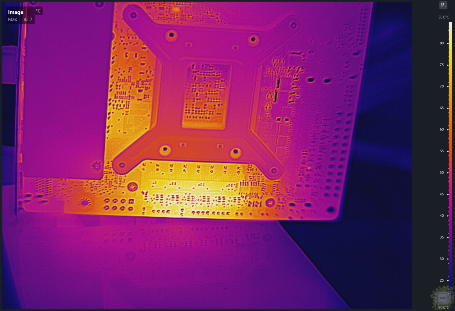 Температура платы с обратной стороны в области подсистемы питания составила 83°С.