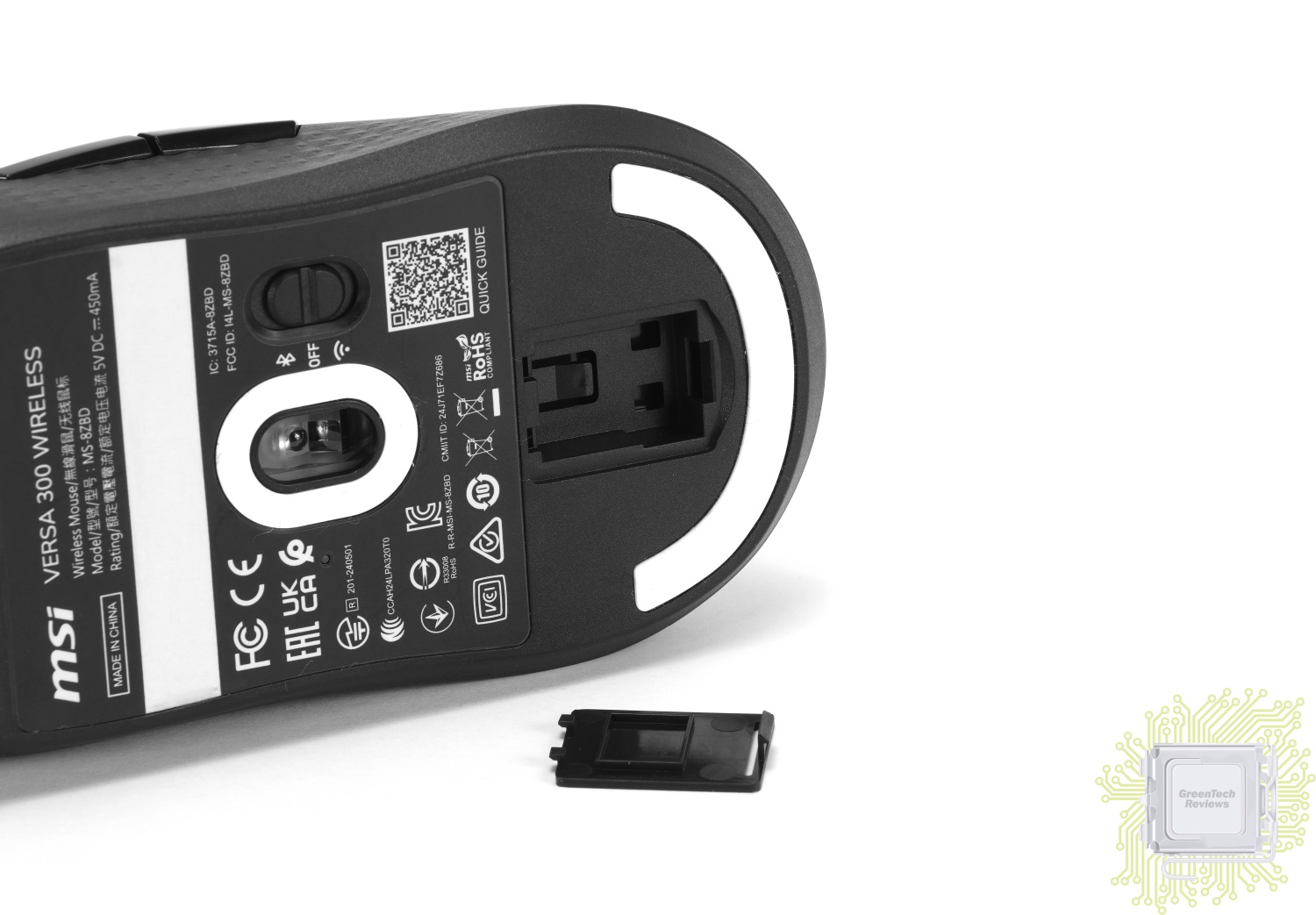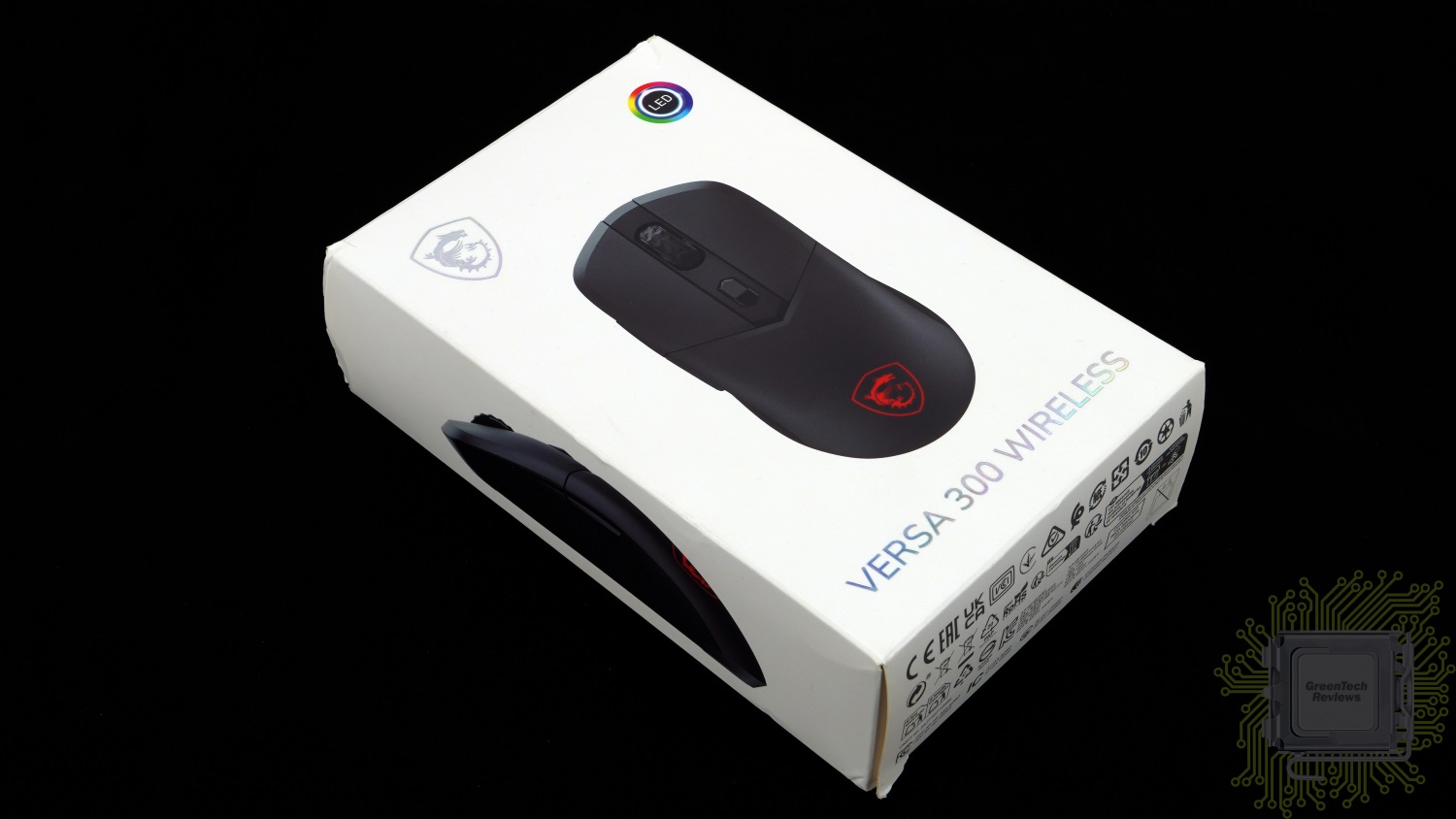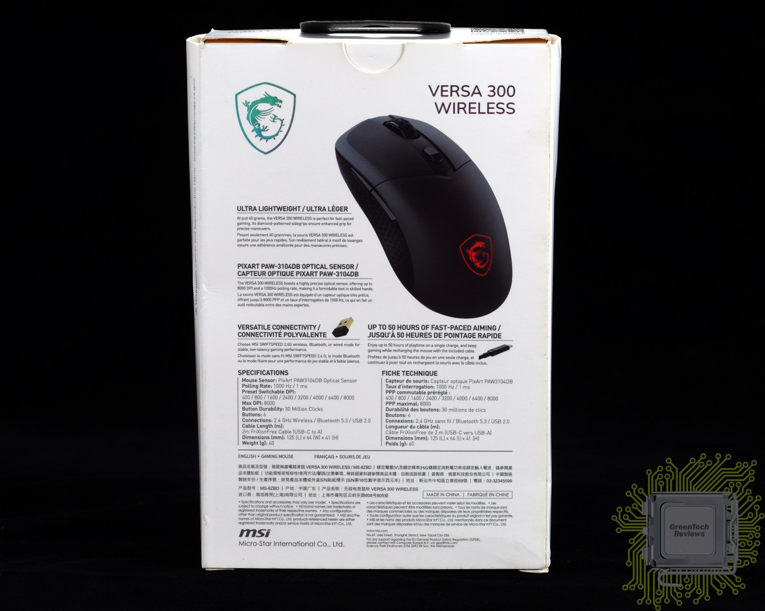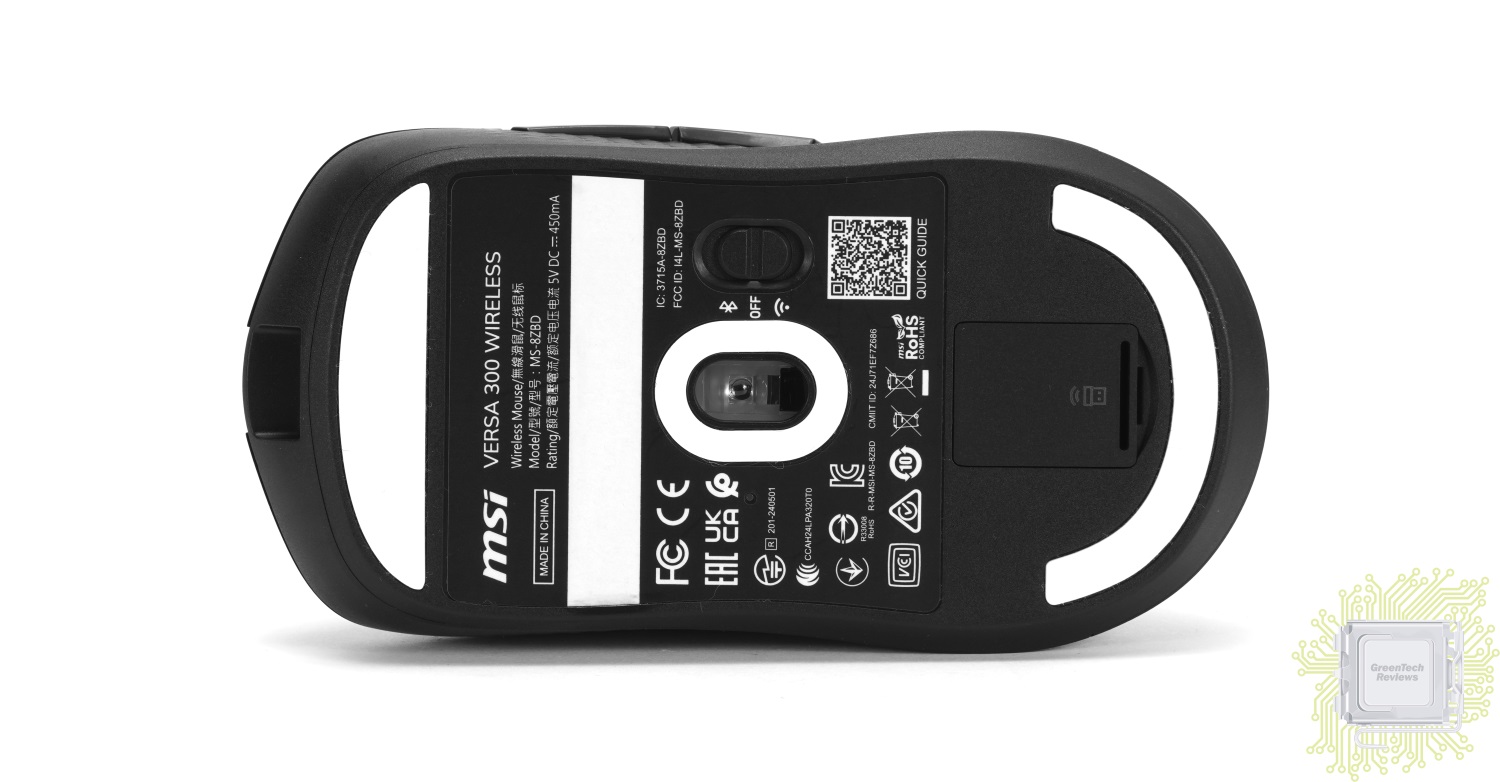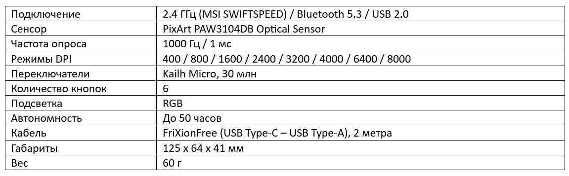 MSI VERSA 300 WIRELESS — бюджетная игровая мышь, основанная на оптическом сенсоре PixArt PAW3104DB и характерная тремя типами подключения — 2,4 ГГц, Bluetooth и проводным USB. Эта модель предлагает владельцу классическую форму корпуса, требует прикладывать к себе минимум усилий (малый вес и очень мягкий кабель), а также отличается отсутствием требований к наличию программного обеспечения — все заявленные режимы работы сохранены в памяти мыши.