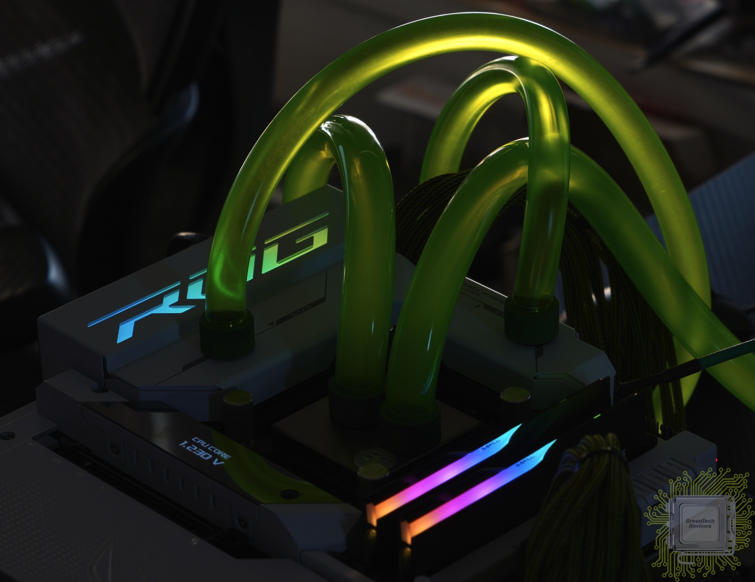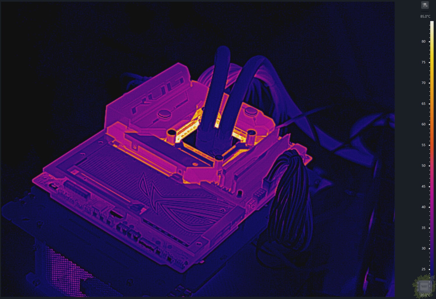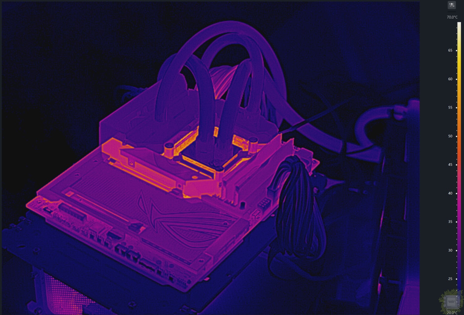 Общий вид на тестовый стенд под нагрузкой. Радиатор подсистемы питания не включён в контур СЖО.