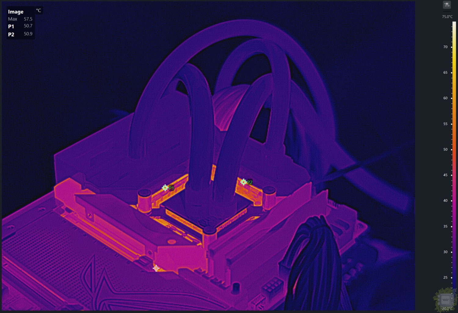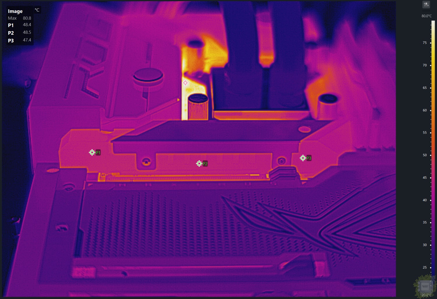 Область подсистемы питания. Левая часть радиатора прогрелась примерно до 76°С. Верхняя секция радиатора прогрелась до примерно 72°С.
