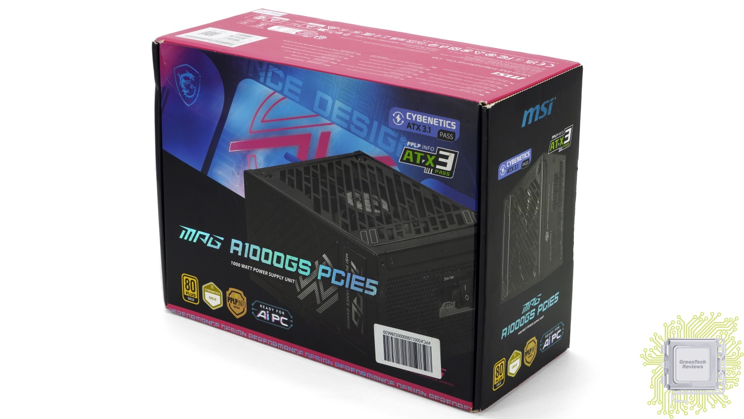 MSI MPG A1000GS PCIE5 поставляется в небольшой коробке чёрно-розового цвета, на фронтальной стороне которой присутствует изображение самого блока, а также указаны его мощность и наличие сертификатов 80 Plus Gold и Cybenetics Gold.