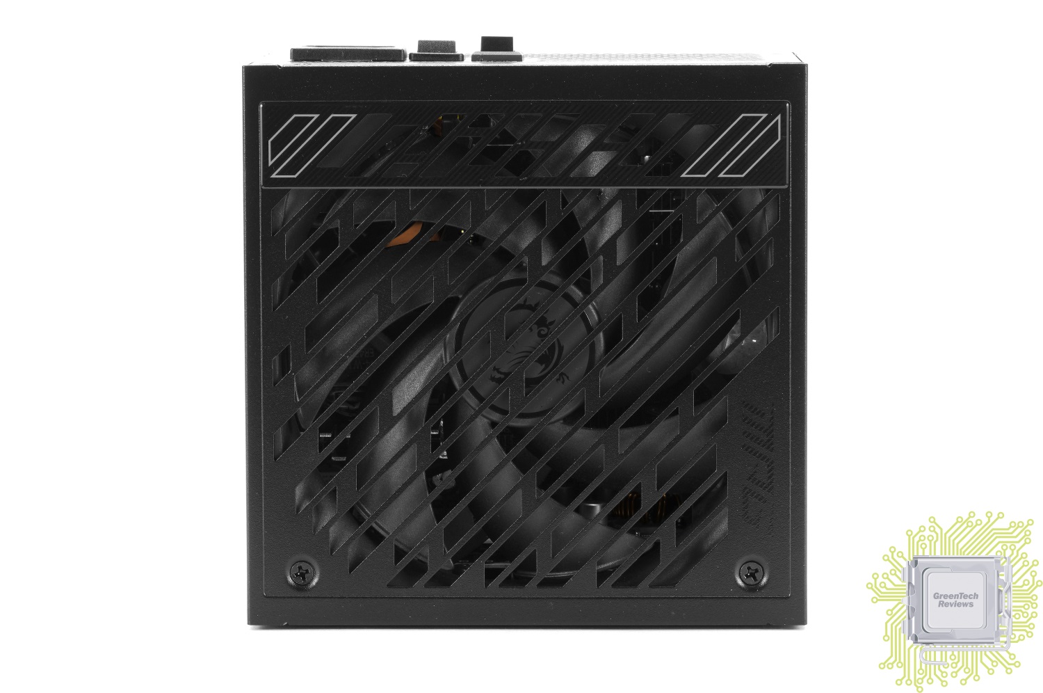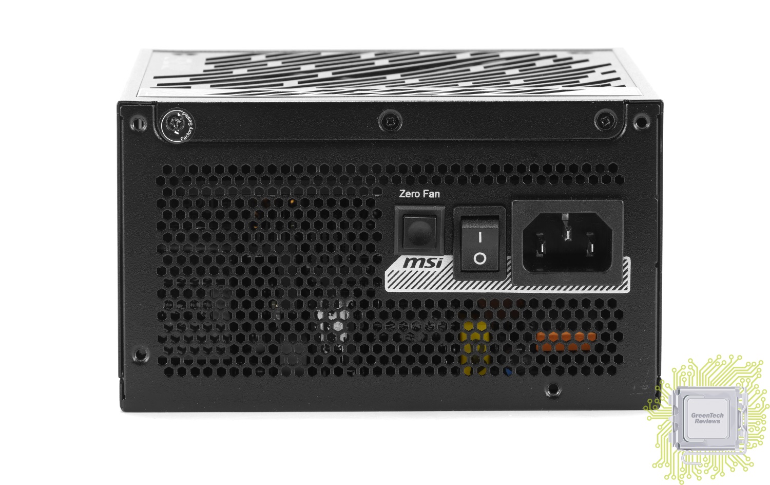 Рядом с разъёмом для подключения силового кабеля присутствует кнопка для управления питанием, рядом с которой размещена кнопка Zero Fan — при активации этой технологии вентилятор полностью остановлен при нагрузках до 40%.