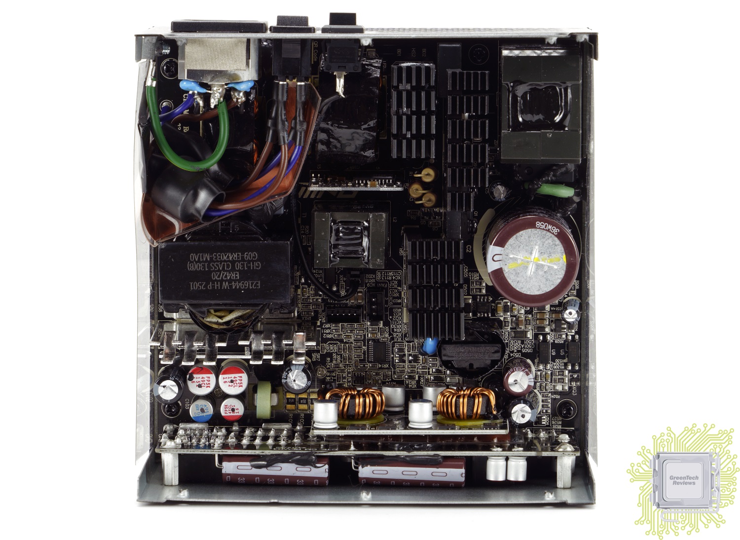 EMI-фильтр и система защиты непосредственно самого блока питания в сумме включает в себя четыре Y-конденсаторов, два X-конденсатора, две дроссельные катушки, варистор, предохранитель, NTC термистор SCK207R0.