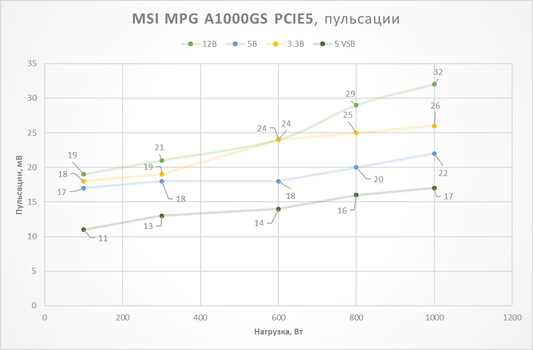 Были замерены пульсации по трём основным линиям при разной нагрузке. По стандарту по 12 В линии допустимы пульсации до 120 мВ, по линиям 5 В и 3.3 В – до 50 мВ. Результат хорош — немного блоков питания на рынке в этой ценовой категории, которые демонстрируют подобные цифры.