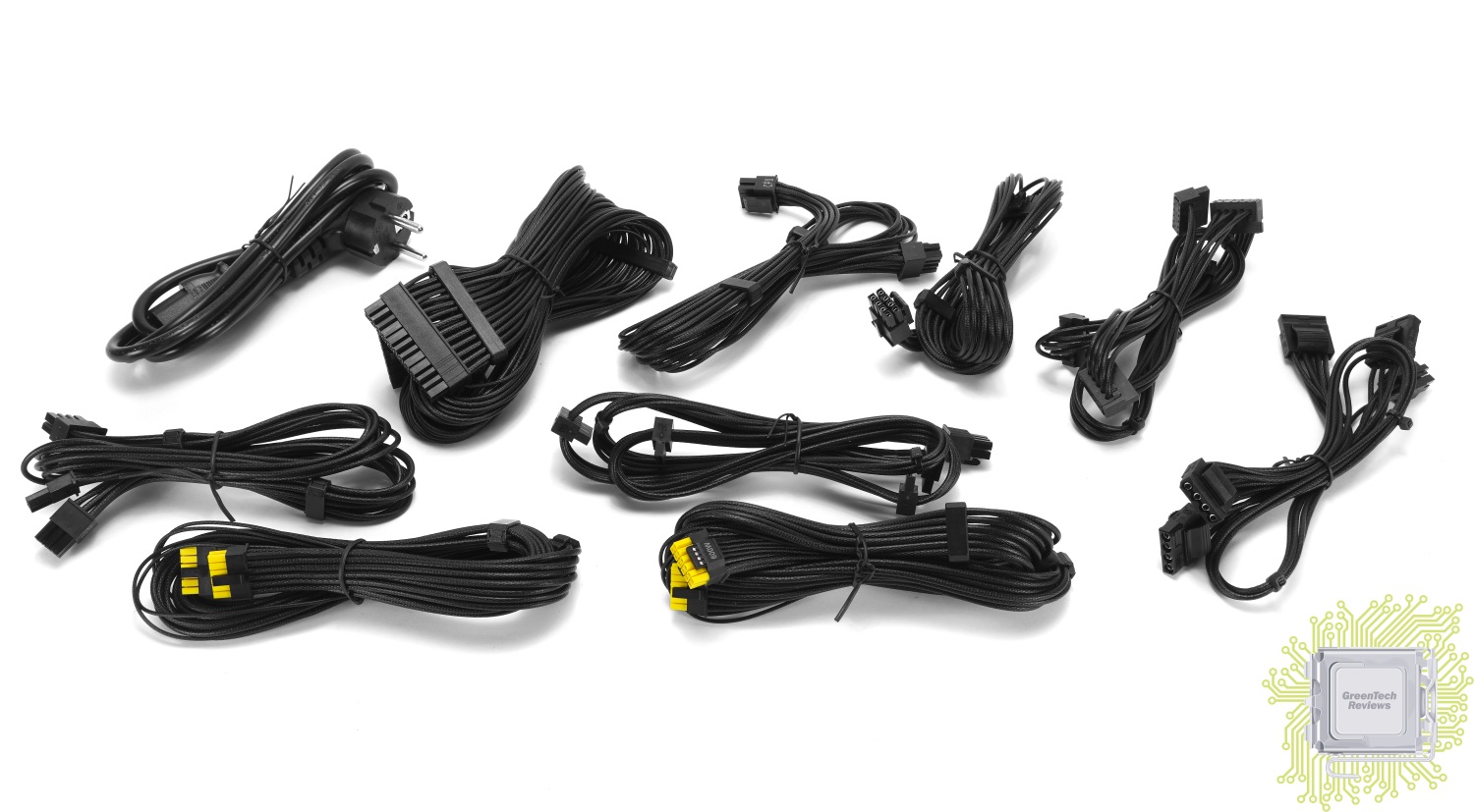 Разложим все кабели перед собой. Их не очень много по уже озвученной выше причине — нет множества кабелей для питания PCIe устройств (6, 6+2 или 8-контактных классических). Такой кабель есть только один, как и соответствующий ему разъём на самом блоке питания.