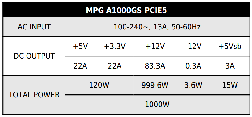 MPG A1000GS PCIE5 – блок питания от MSI, обладающий мощностью 1000 Вт, которая подтверждена сертификацией уровня Gold по результатам тестирования в 80Plus и Cybenetics. Кроме того, он оборудован сразу двумя новейшими разъёмами для питания видеокарт, которые получили название 12V-2×6 и который пришёл на смену разъёму 12VHPWR. Такое решение потребовало сокращение «классических» кабелей PCIe (6+2) до всего одного, поэтому, если вы рассматриваете этот блок питания для приобретения, то стоит иметь это в виду.