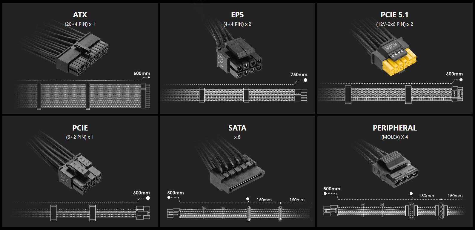 Полный набор штекеров и длина кабелей представлена на официальном слайде, который взят с сайта производителя:
