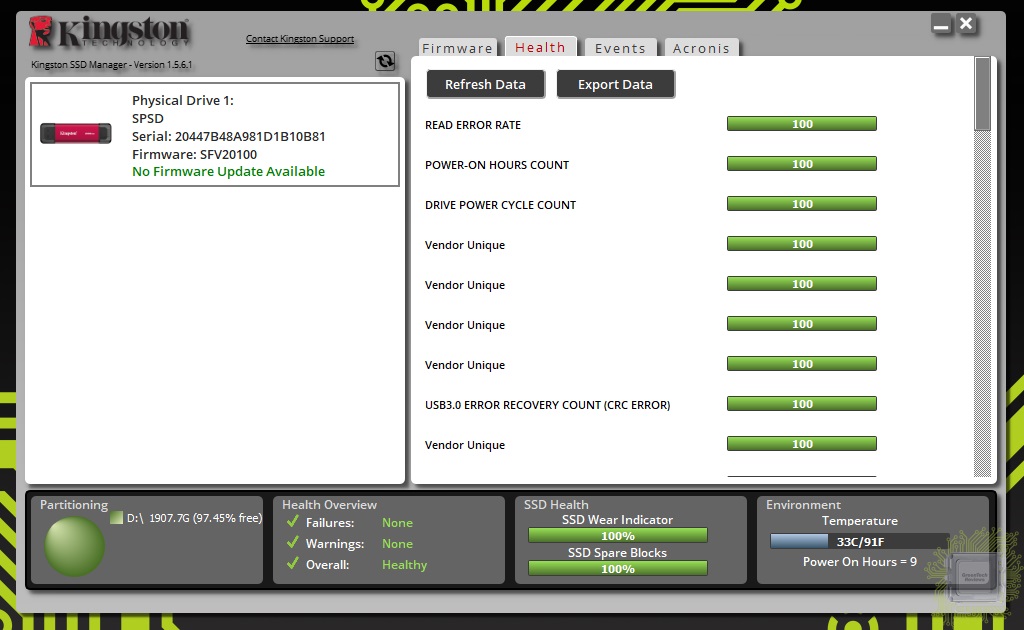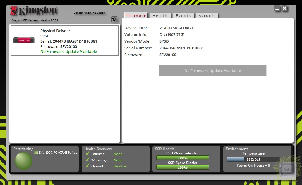 Для работы с накопителем производитель реализовал программное обеспечение Kingston SSD Manager, которое едино для многих устройств, включая внешние диски.