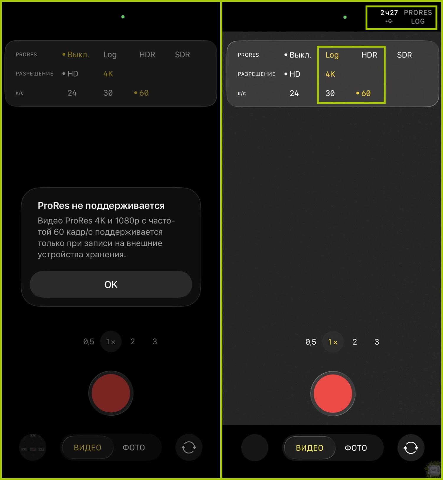 Симуляция записи видео. Справа цифры по вертикали — количество кадров в секунду, записываемое на накопитель. Практически все форматы доступны для записи.