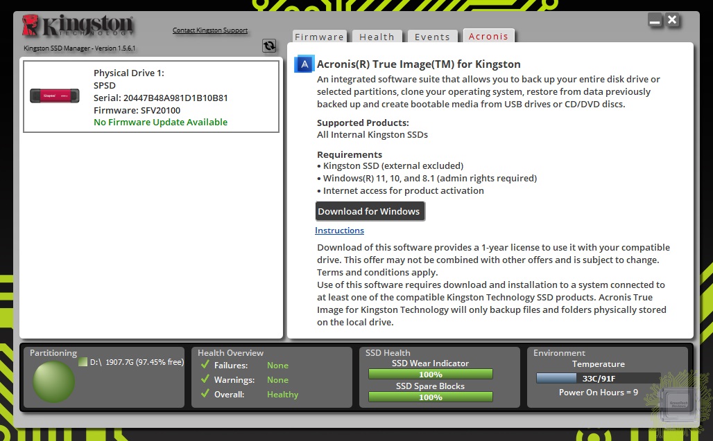 В разделе Acronis размещена информация о программе Acronis True Image (специальная версия для Kingston) и кнопка для её скачивания. Эта программа предназначена для переноса или резервирования данных как в виде разделов вашего диска, так и всего диска сразу. Что касается лицензии, то она основана на наличии SSD производителя в системе. Если такового нет, то программа потребует активацию.