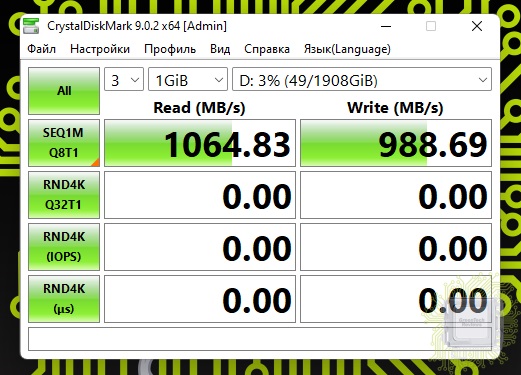 Классический тест CrystalDiskMark, режим — пиковая производительность, файл размером 1 ГБ.