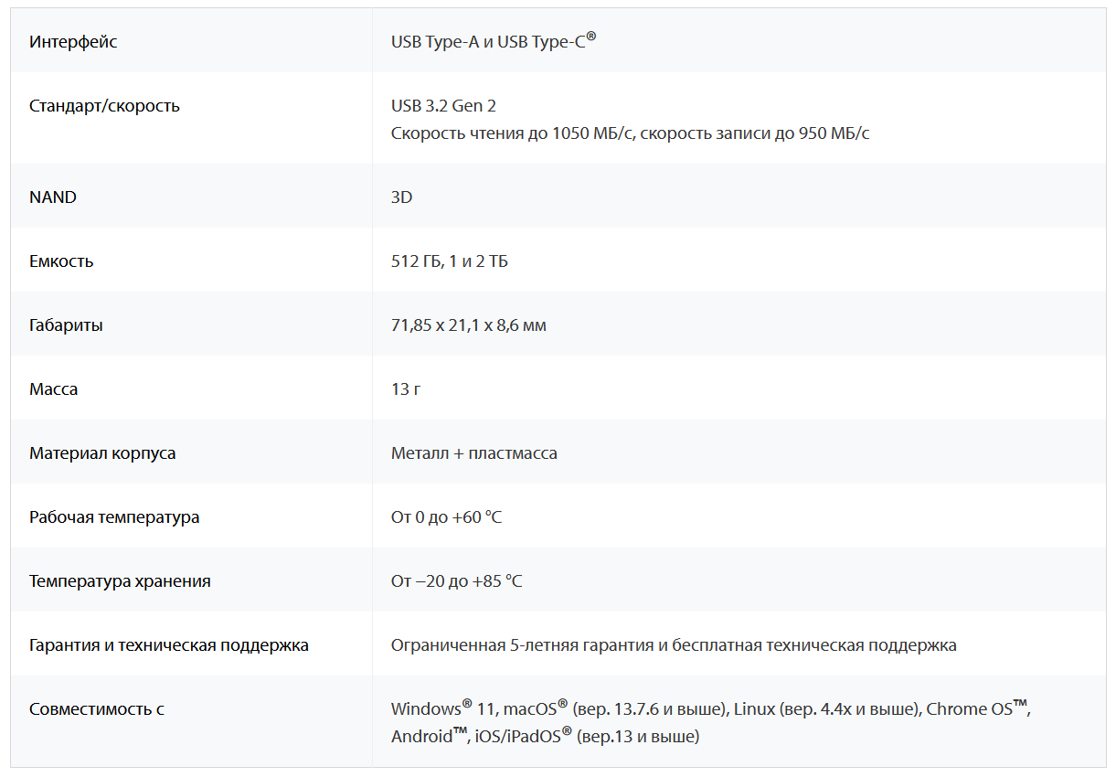 Все основные характеристики модельного ряда Dual Portable SSD представим в виде таблицы, взятой на официальном сайте производителя.