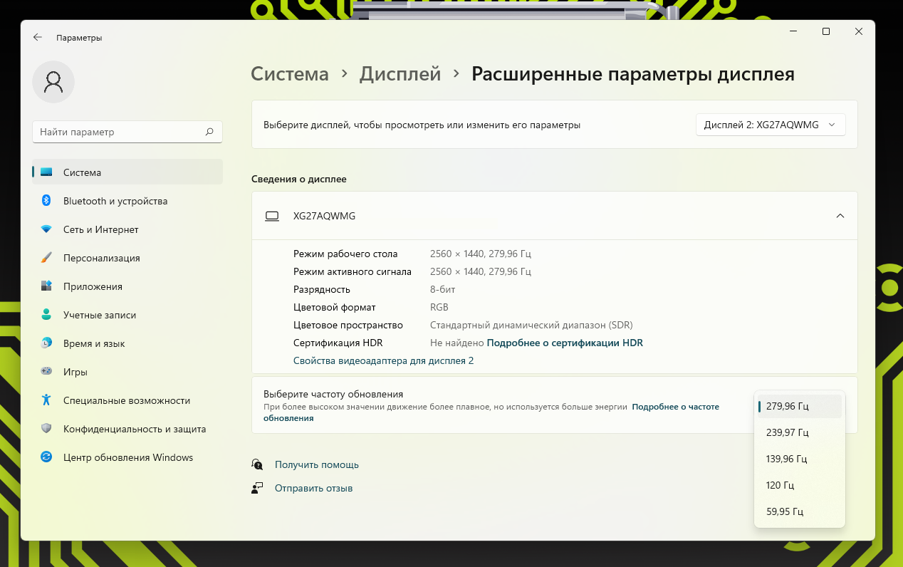 Монитор позволяет выбрать пять режимов частоты обновления — от 60 до 280 Гц.