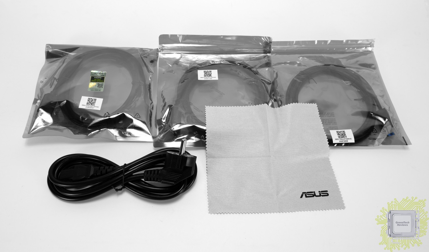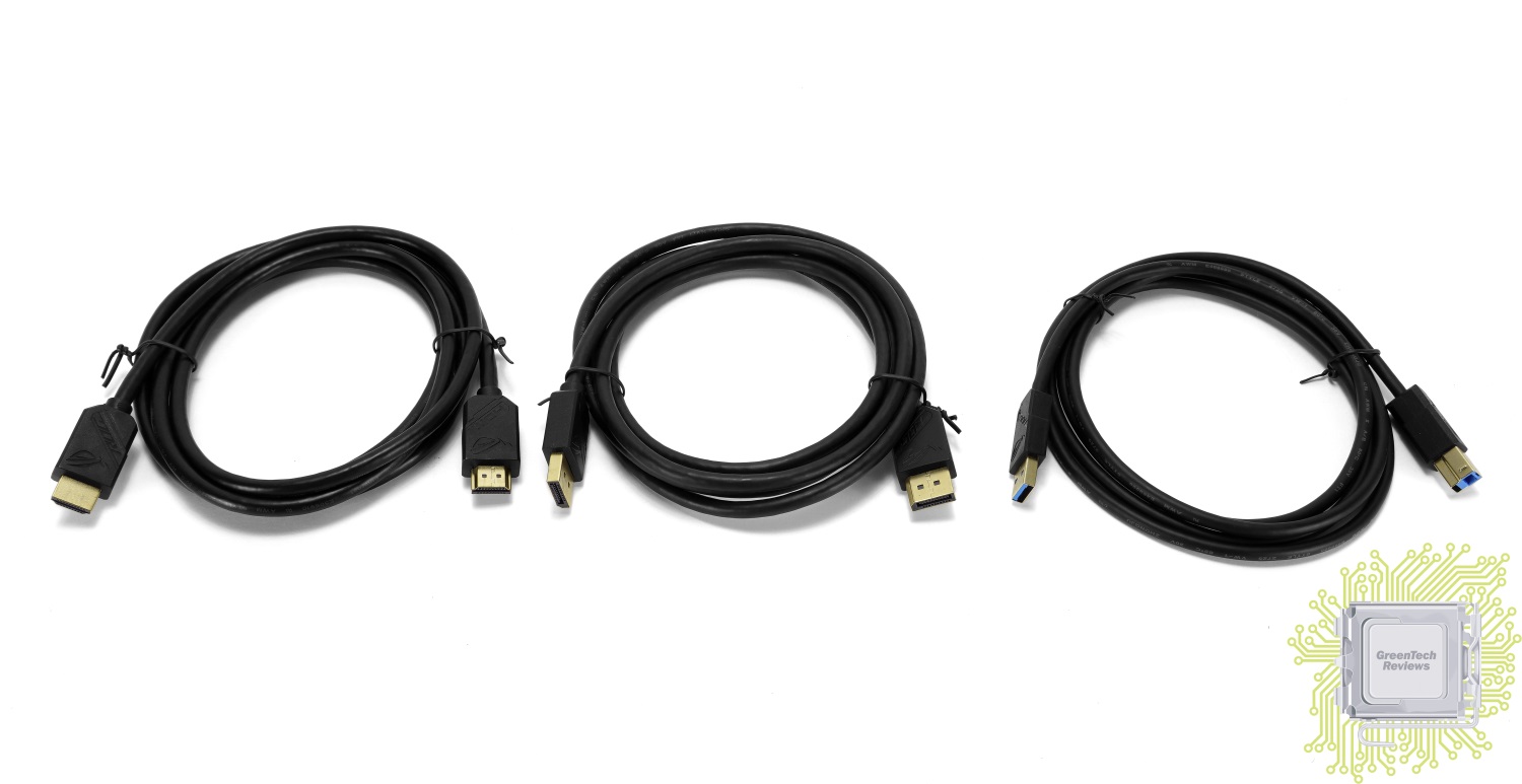 В антистатических пакетах находятся три кабеля — USB Type-C, USB Type-B (3.0), HDMI и DisplayPort.
