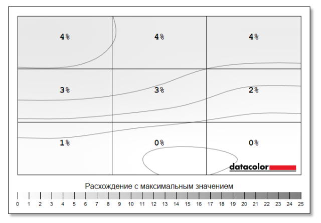 Равномерность подсветки достаточно хороша, но не лучшая среди других OLED мониторов производителя отклонение составляет 4%.