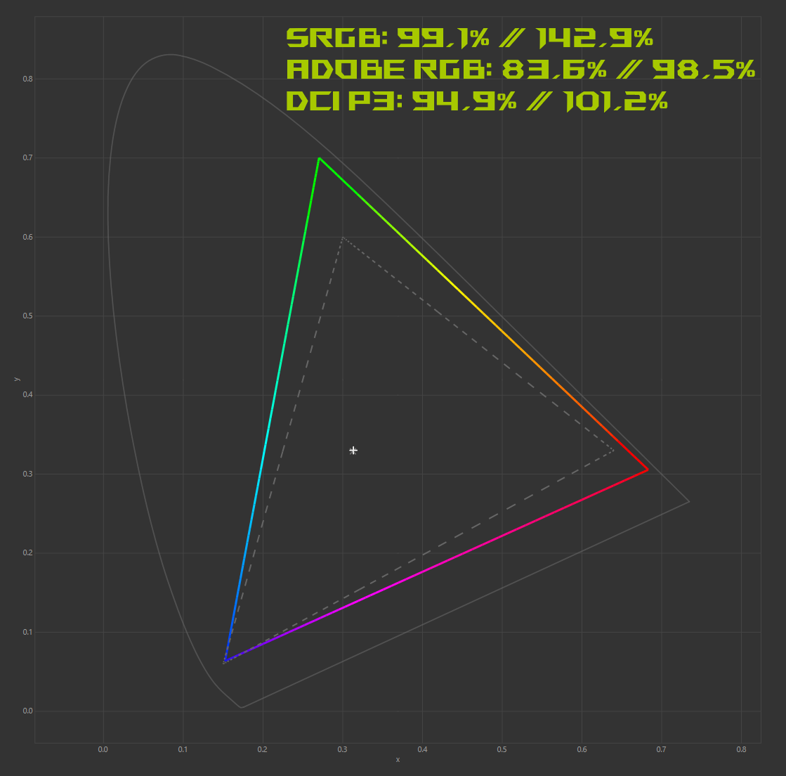 При стандартных настройках дисплей соответствует sRGB на 99,1% (полный охват — 142,9%), Adobe RGB на 83,6% (полный охват — 98,5%) и DCI P3 на 94,9% (полный охват — 101,2%).
