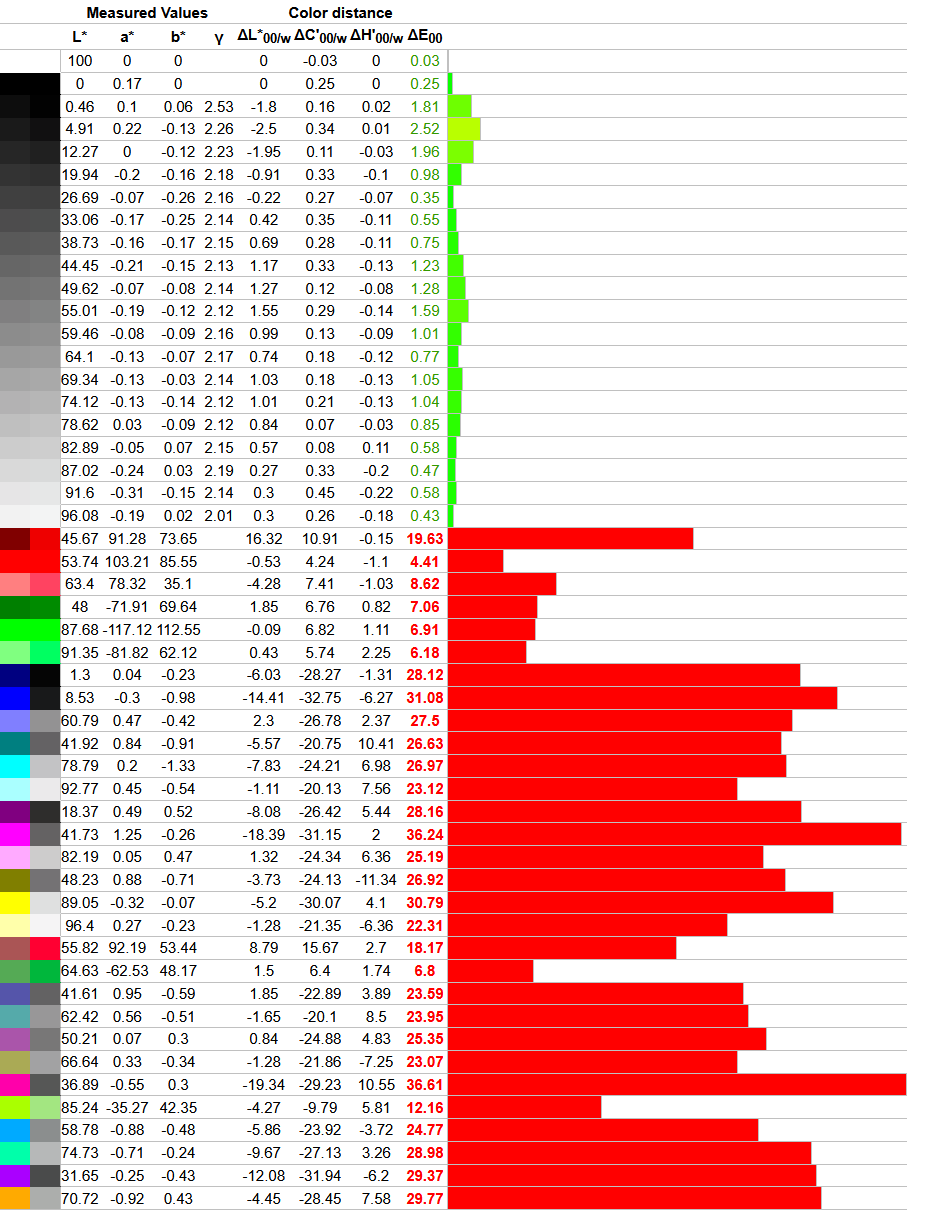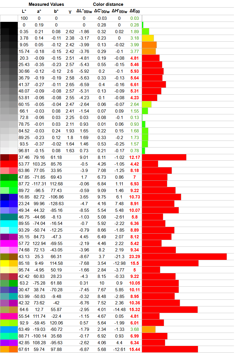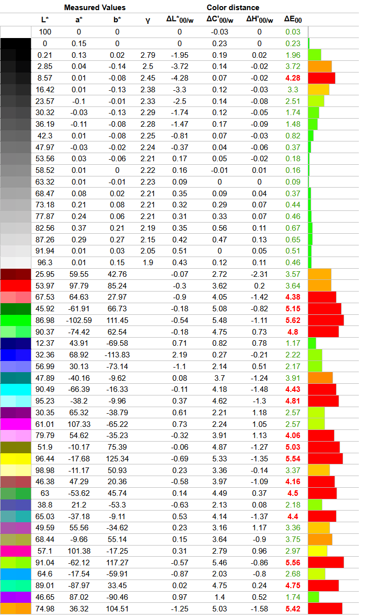 Что касается отклонений цветопередачи, то мы получили такие результаты. Напомним, что очень хорошими результатами являются показатели отклонения DeltaE (среднее значение) менее единицы, а максимальное отклонение DeltaE – менее трёх.
