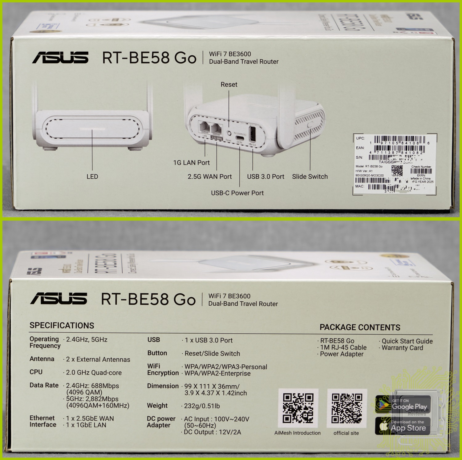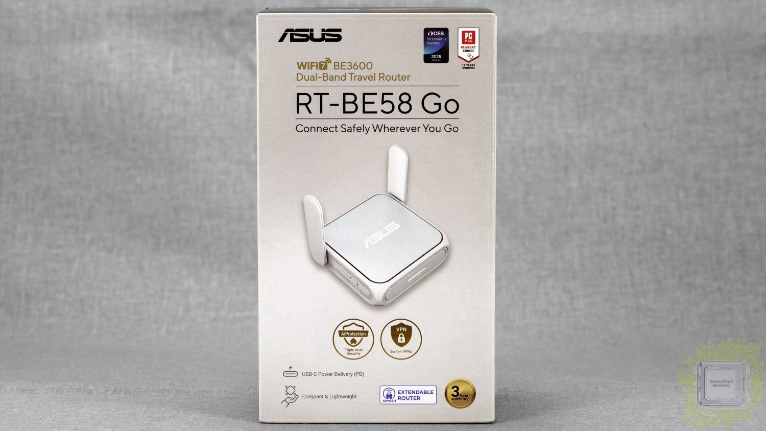 Поставляется ASUS RT-BE58 Go в компактной коробке с фирменным дизайном, но в светлых цветах. На фронтальной стороне изображено само устройство, а также его ключевые особенности.