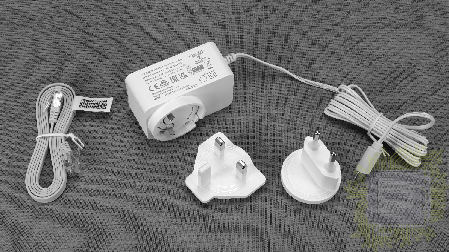Комплект поставки включает в себя руководство пользователя, листовки с информацией о гарантии и информации о настройке, сетевой кабель, внешний адаптер питания и две насадки для него.