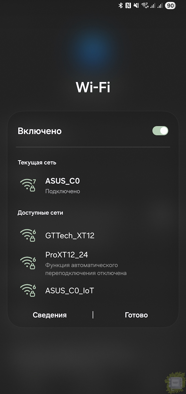 Для тестирование ASUS RT-BE58 Go он был подключён кабелем к модулю ячеистой сети ZenWiFi Pro XT12. Этот модуль был подключён ко второму такому же, но уже «по воздуху» (соединение между модулями в таком режиме — около 2,4 Гбит/с). И именно к этому модулю уже и был подключён интернет. А замер скорости проводился при помощи смартфона Samsung Galaxy Z Fold7, подключённого именно к RT-BE58 Go. Тестирование проводилось воскресным днём, когда дополнительными «пожирателями» трафика были один ПК, один ноутбук, три смартфона и один телевизор. Тариф подключения предполагает скорость до 800 Мбит/с.